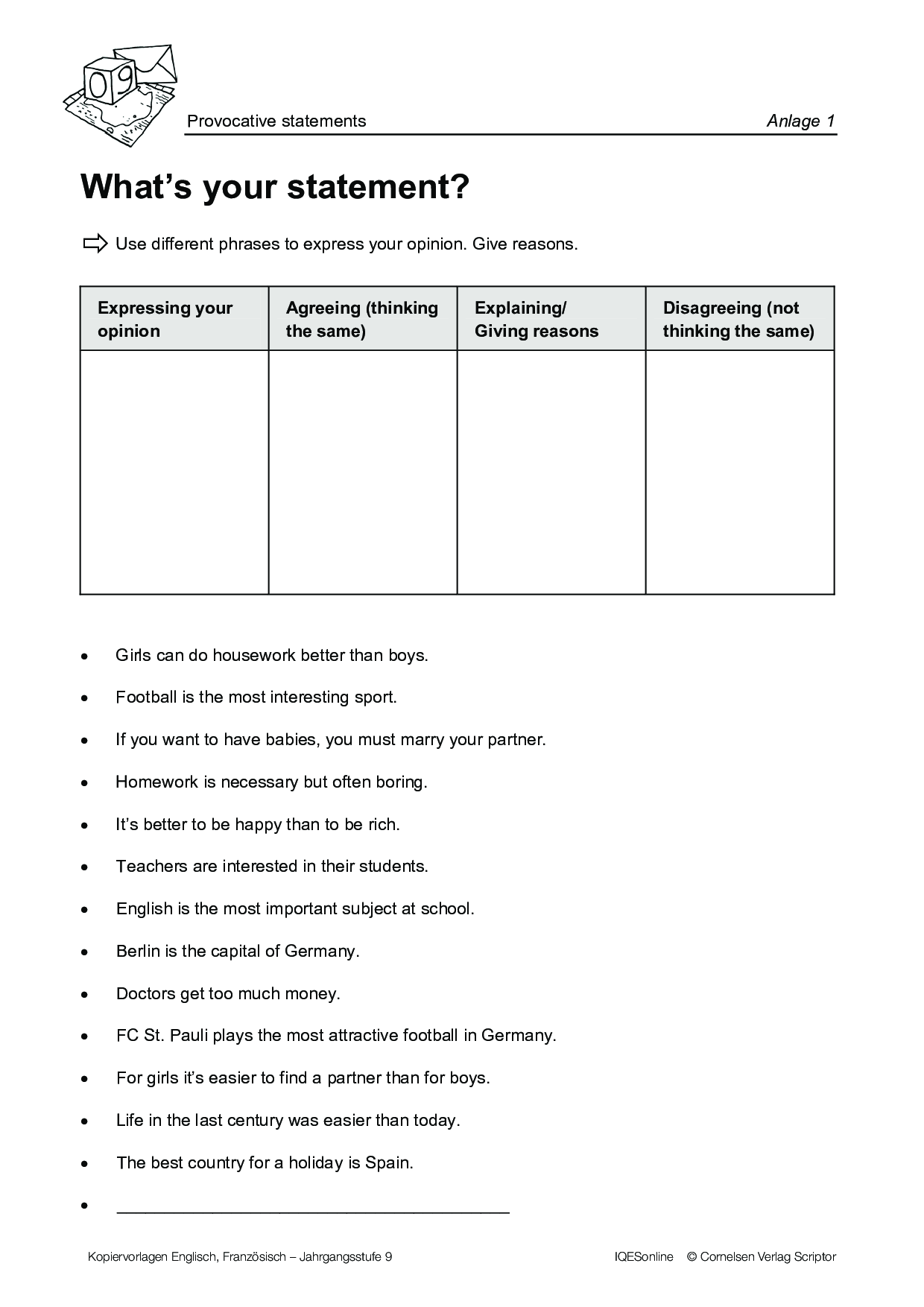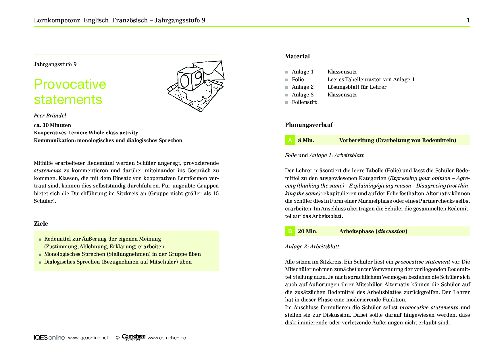 Mithilfe erarbeiteter Redemittel werden die Schüler und Schülerinnen angeregt, provozierende statements (auf Englisch) zu kommentieren und darüber miteinander ins Gespräch zu kommen. Die Lerneinheit dauert circa 30 Minuten und richtet sich an die Jahrgangsstufe 9.