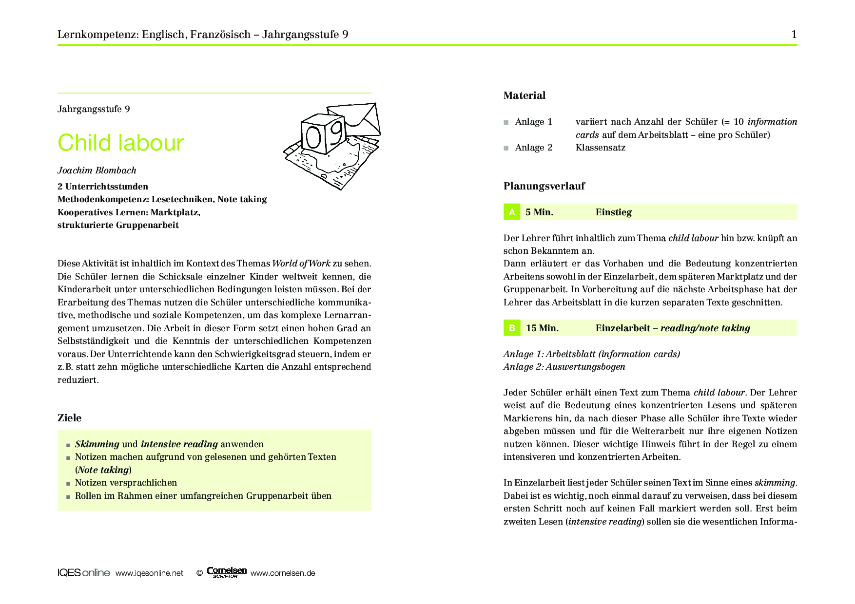 In diesen zwei Englischunterrichtsstunden wird das Thema Kinderarbeit behandelt. Dabei müssen die Lernenden zu einem grossen Teil selbständig arbeiten. Ziel ist es unter anderem, die kooperative Lernform Marktplatz anzuwenden.