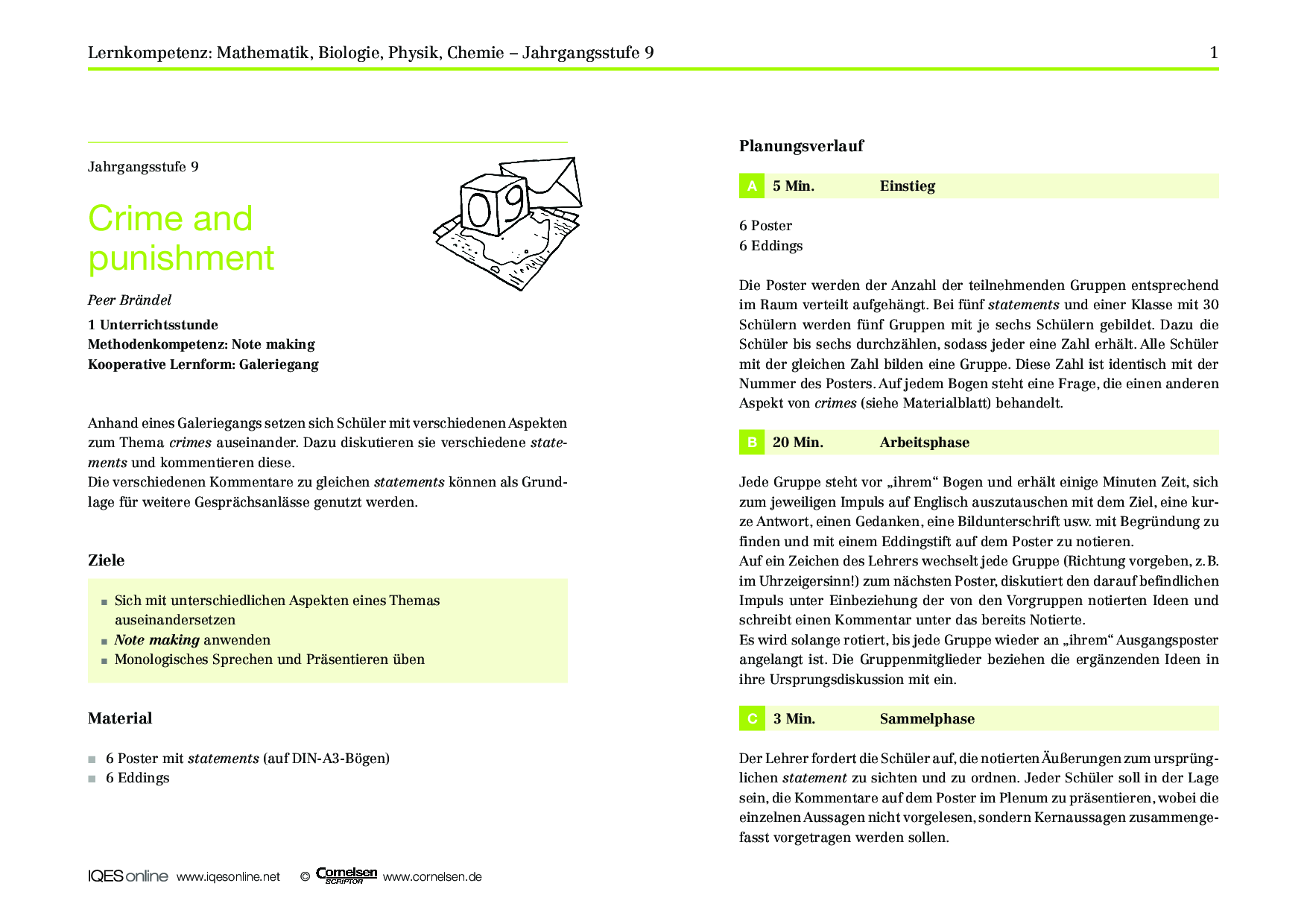 Anhand eines Galeriegangs setzen sich Schüler mit verschiedenen Aspekten zum Thema «crimes» im Fach Englisch auseinander. Dazu diskutieren sie verschiedene statements und kommentieren diese. Die verschiedenen Kommentare zu gleichen statements können als Grundlage für weitere Gesprächsanlässe genutzt werden. (1 Lektion).