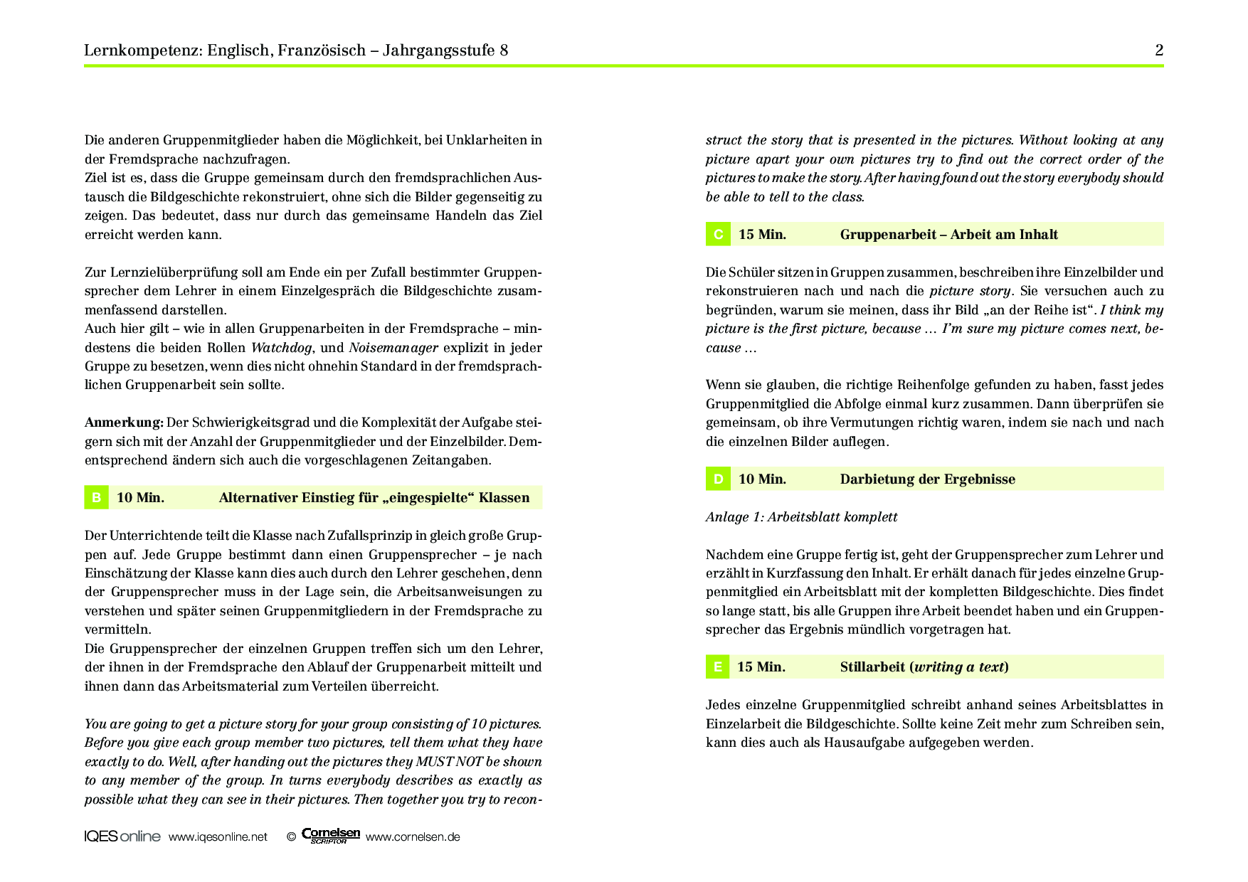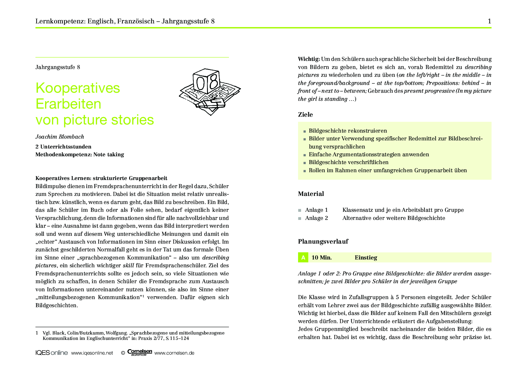 Blombach verdeutlicht die Relevanz von Bildergeschichten für den Fremdsprachenunterricht. Er legt den Fokus dabei auf das Üben der sprachbezogenen Kommunikation und der Methodenkompetenz note taking. Zur Verdeutlichung der Theorie finden Sie in diesem Dokument zwei ausführlich beschriebene Unterrichtsstunden für die Jahrgangsstufe 8.