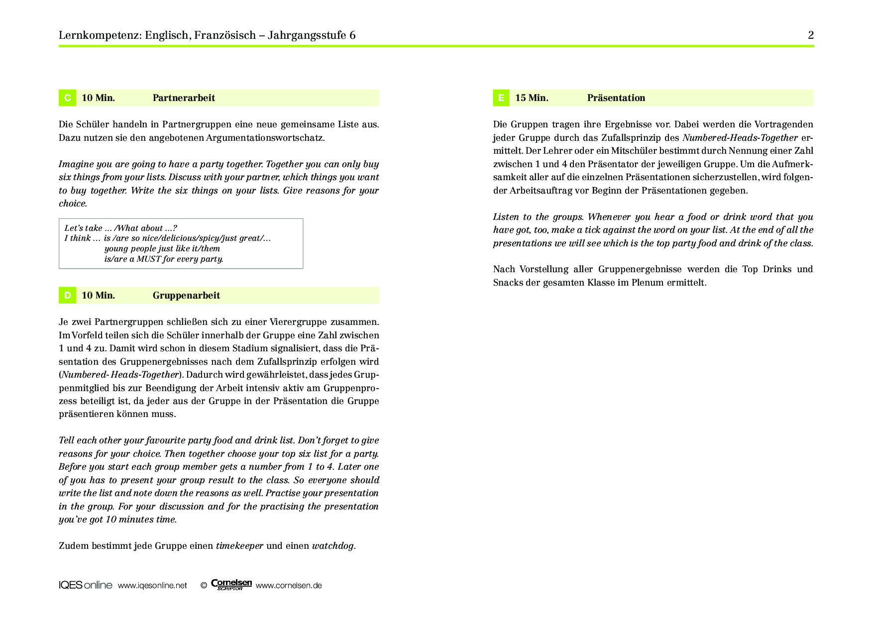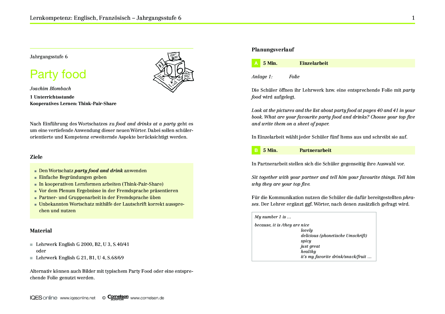 Nach Einführung des Wortschatzes im Fach Englisch zu food and drinks at a party geht es um eine vertiefende Anwendung dieser neuen Wörter. Diese Unterrichtseinheit für die 6. Stufe greift das Thema mit der Kooperativen Methode Think-Pair-Share auf (1 Lektion). Jahrgangsstufe 6.