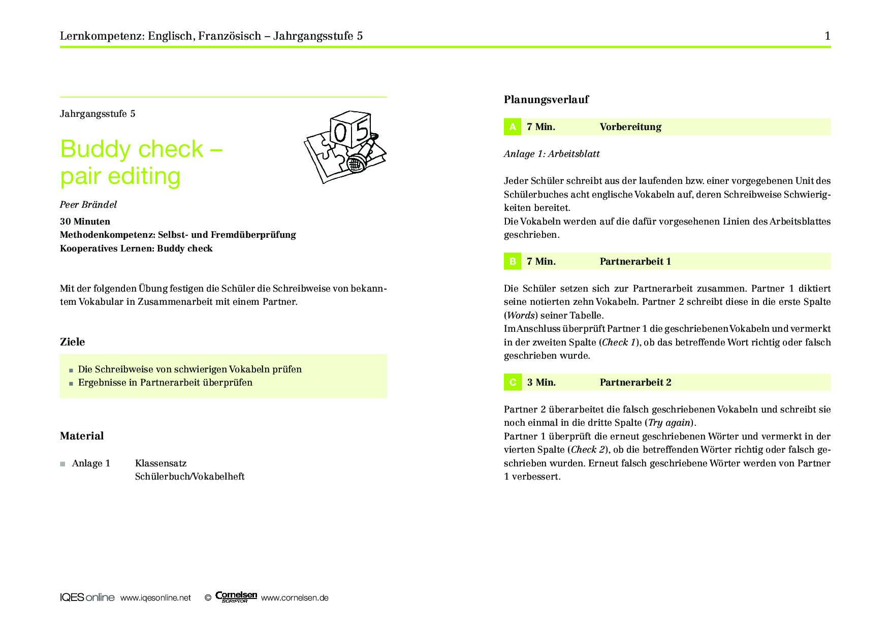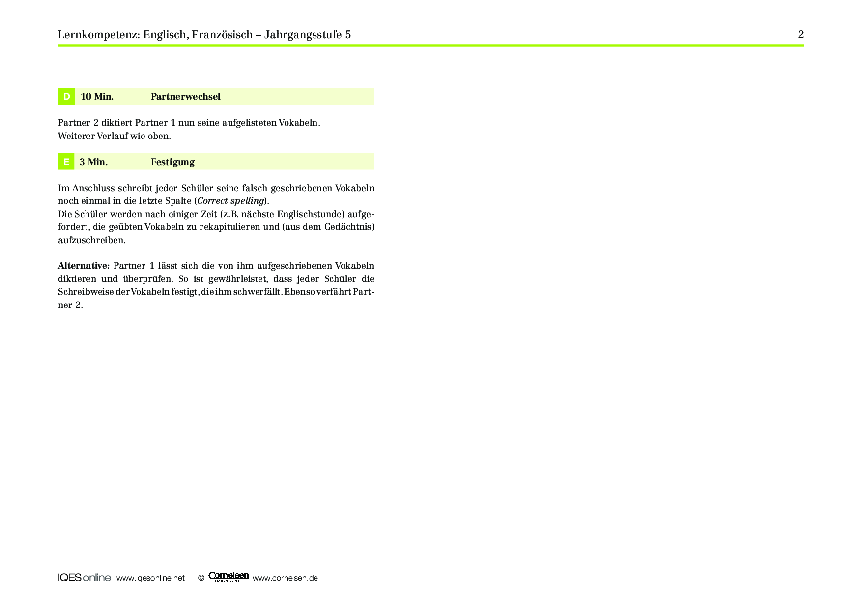 Mit der folgenden Übung festigen die Schüler die Schreibweise von bekanntem Vokabular in Zusammenarbeit mit einem Partner. Ziel ist es, die Schreibweise von schwierigen Vokabeln zu prüfen. Dabei kommt die Methodenkompetenz der Selbst- und Fremdüberprüfung zum Zuge.