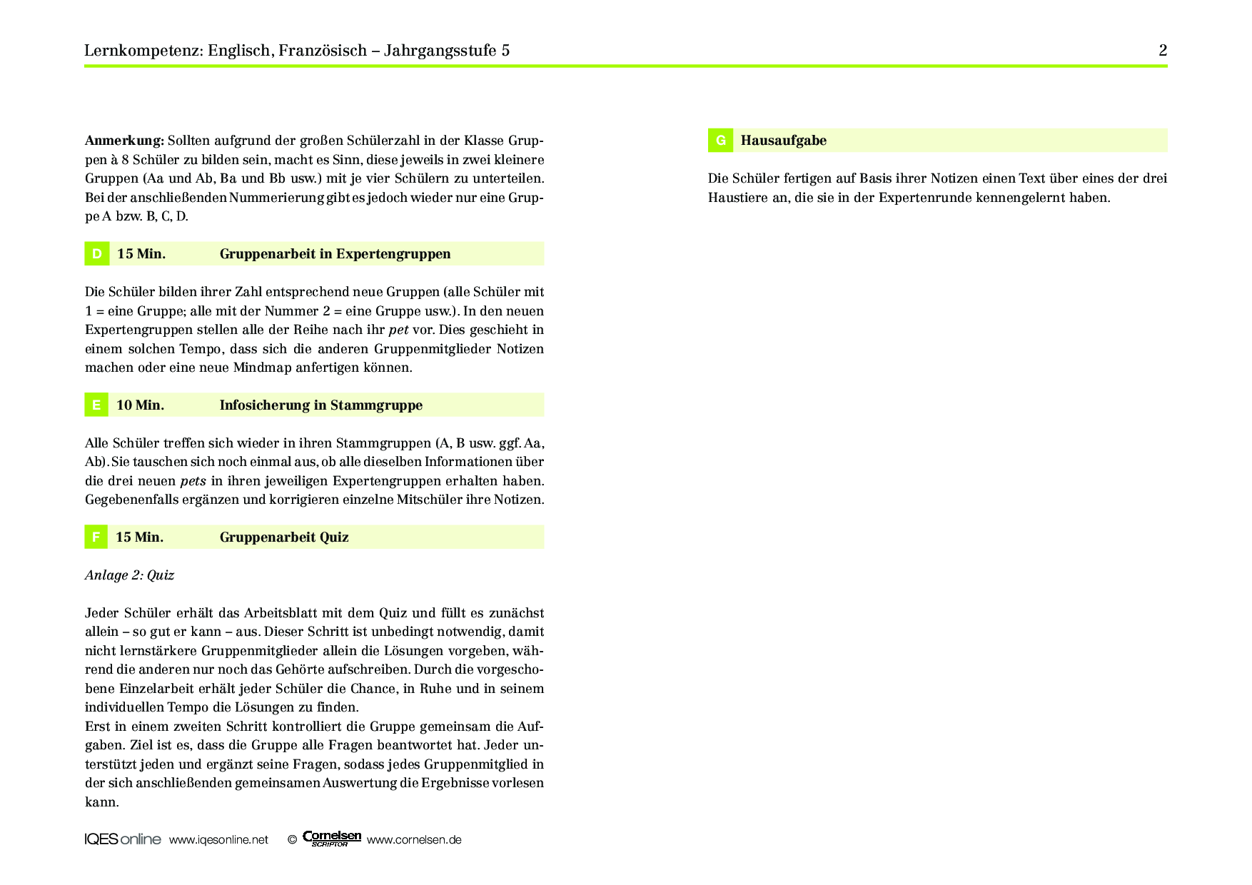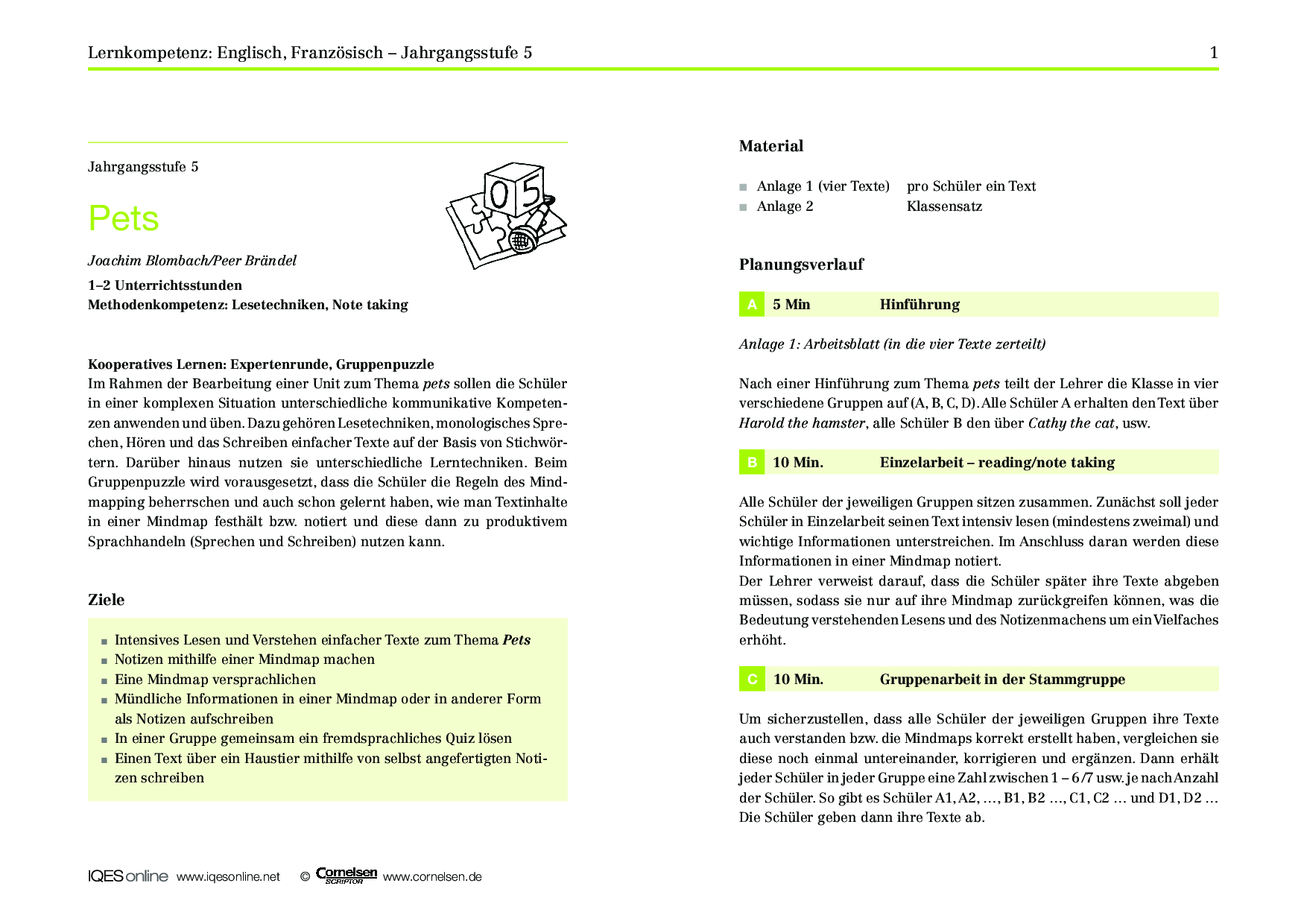 In den hier skizzierten Unterrichtsstunden sollen die Lernenden zum Thema pets in einer komplexen Situation unterschiedliche kommunikative Kompetenzen anwenden und üben. Darüber hinaus nutzen sie unterschiedliche Lerntechniken.