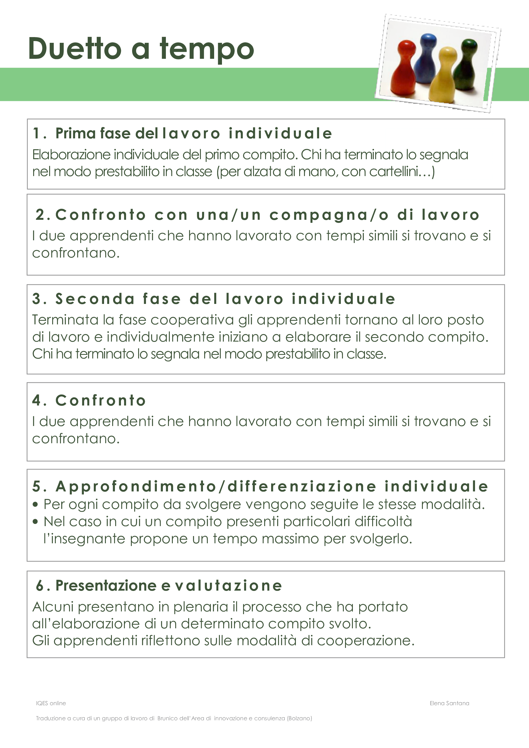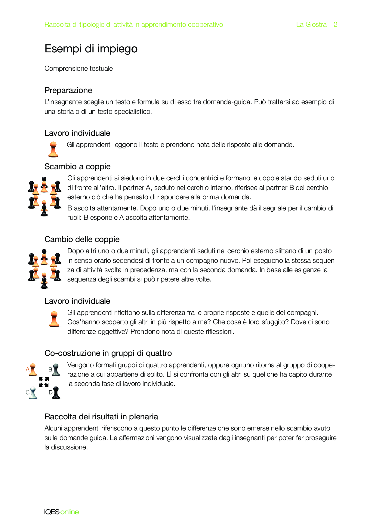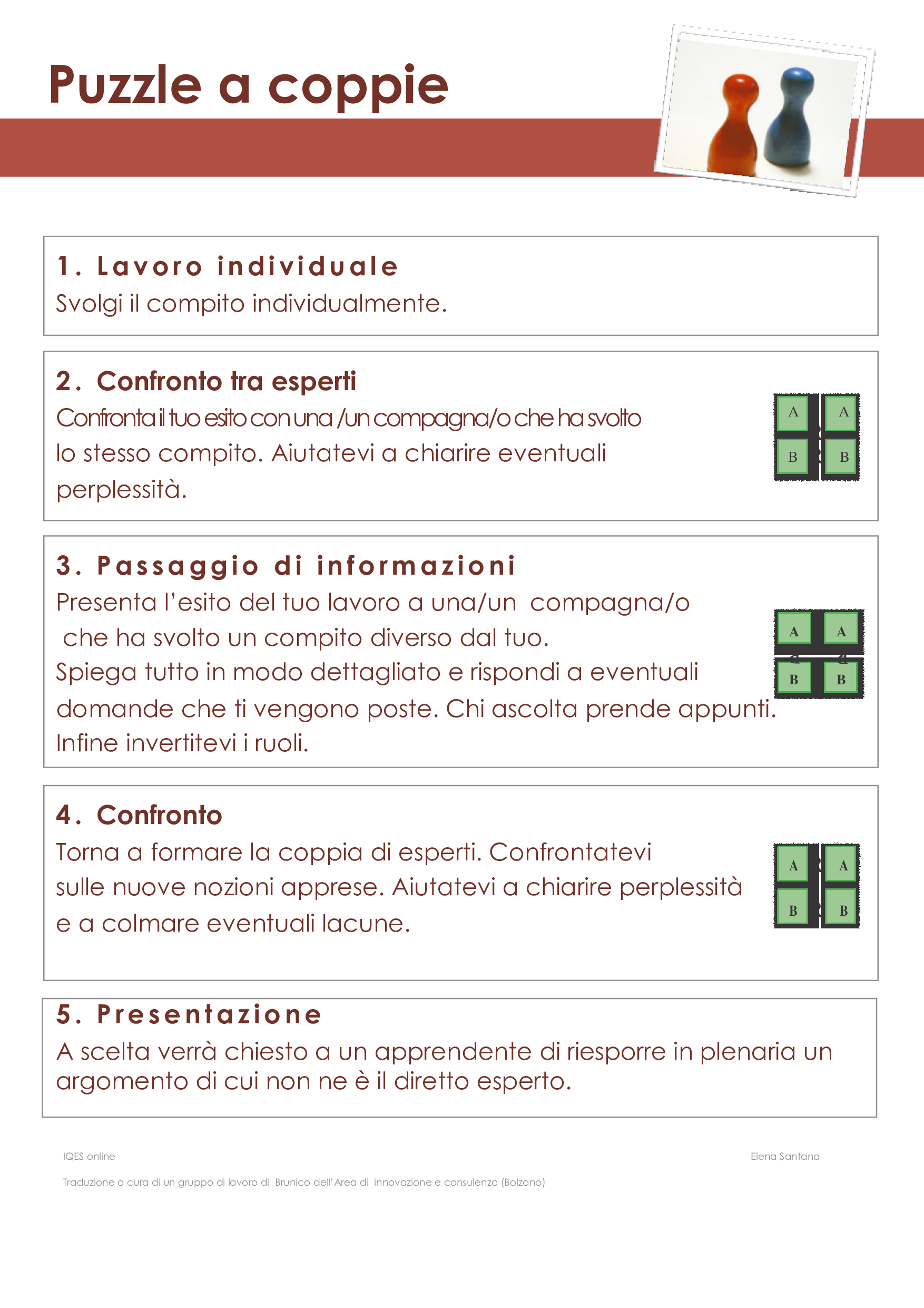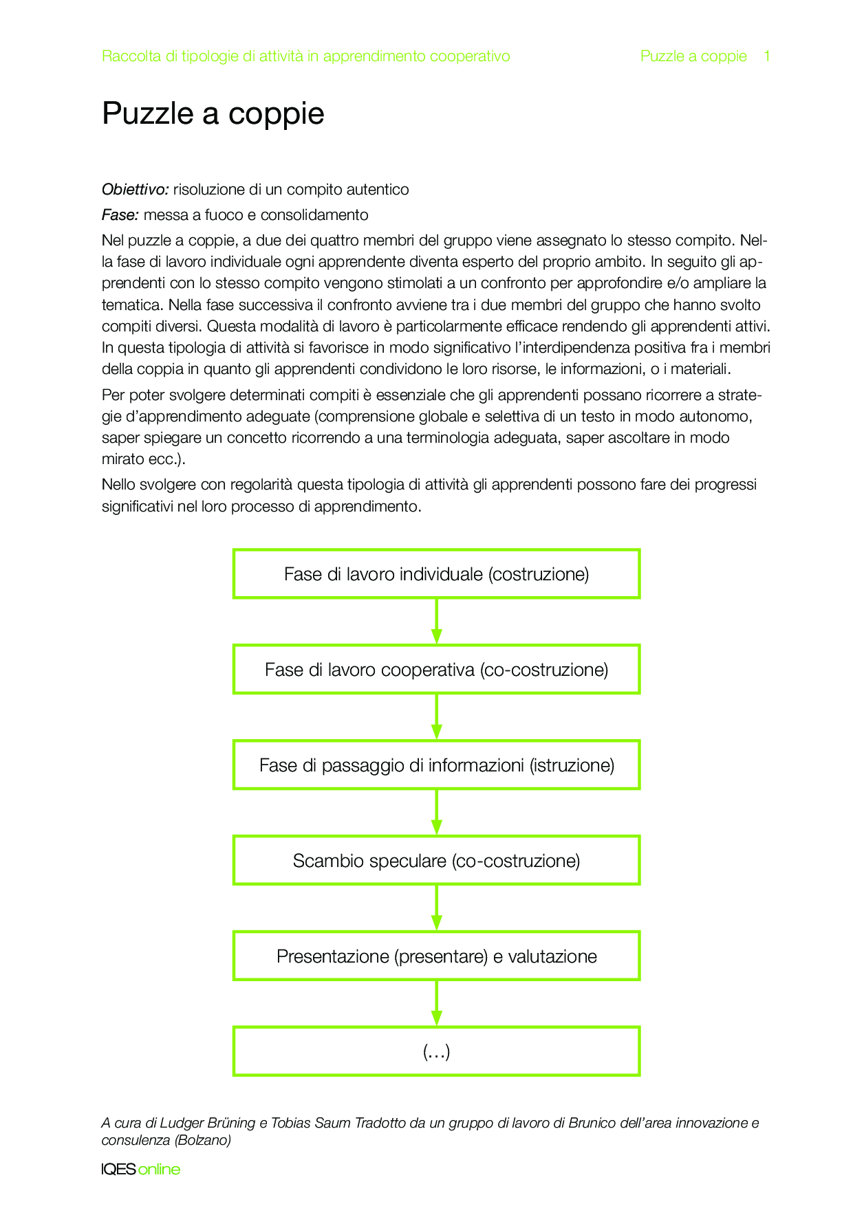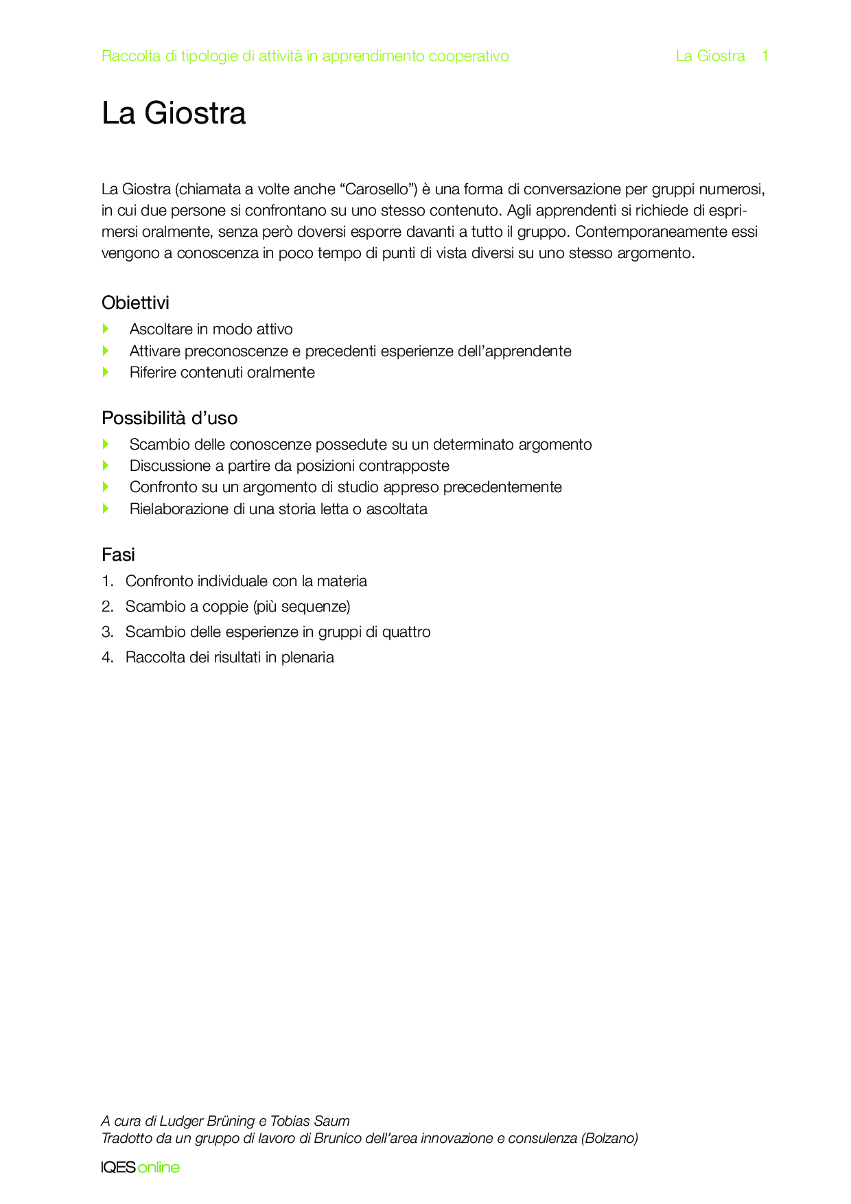 Raccolta di tipologie di attivitä in apprendimento cooperativo - Traduzione a cura di un gruppo di lavoro dell’Area di innovazione e consulenza (Bolzano): Claudia Amato, Paola Cason, Marina Fiorentini, Manuela Guzzetti, Oriana Primucci, Monika Schwingshackl, Raffaele Vaccarin