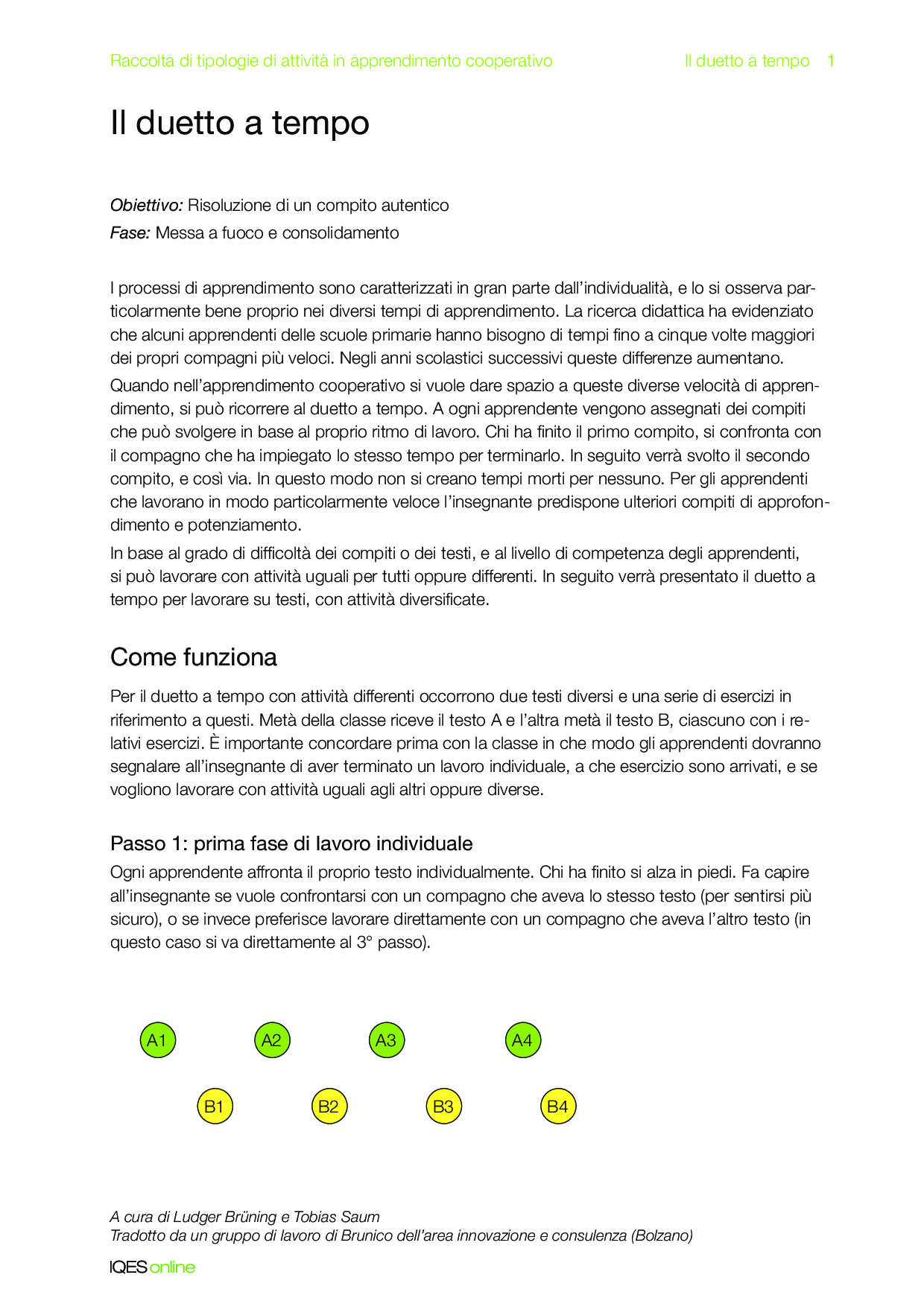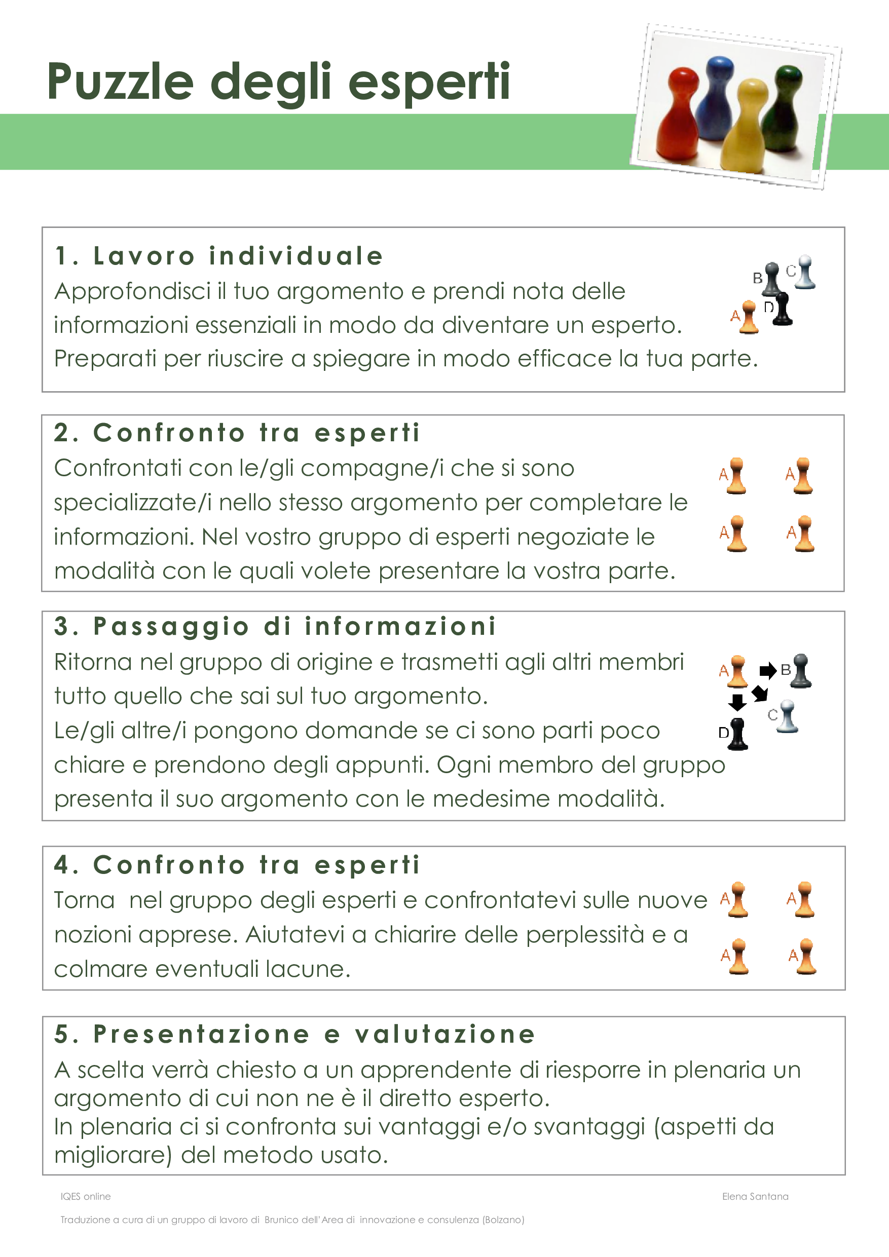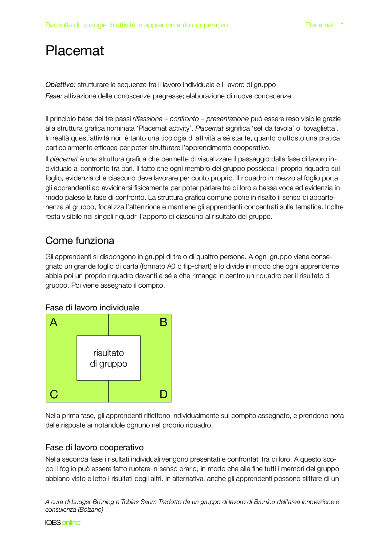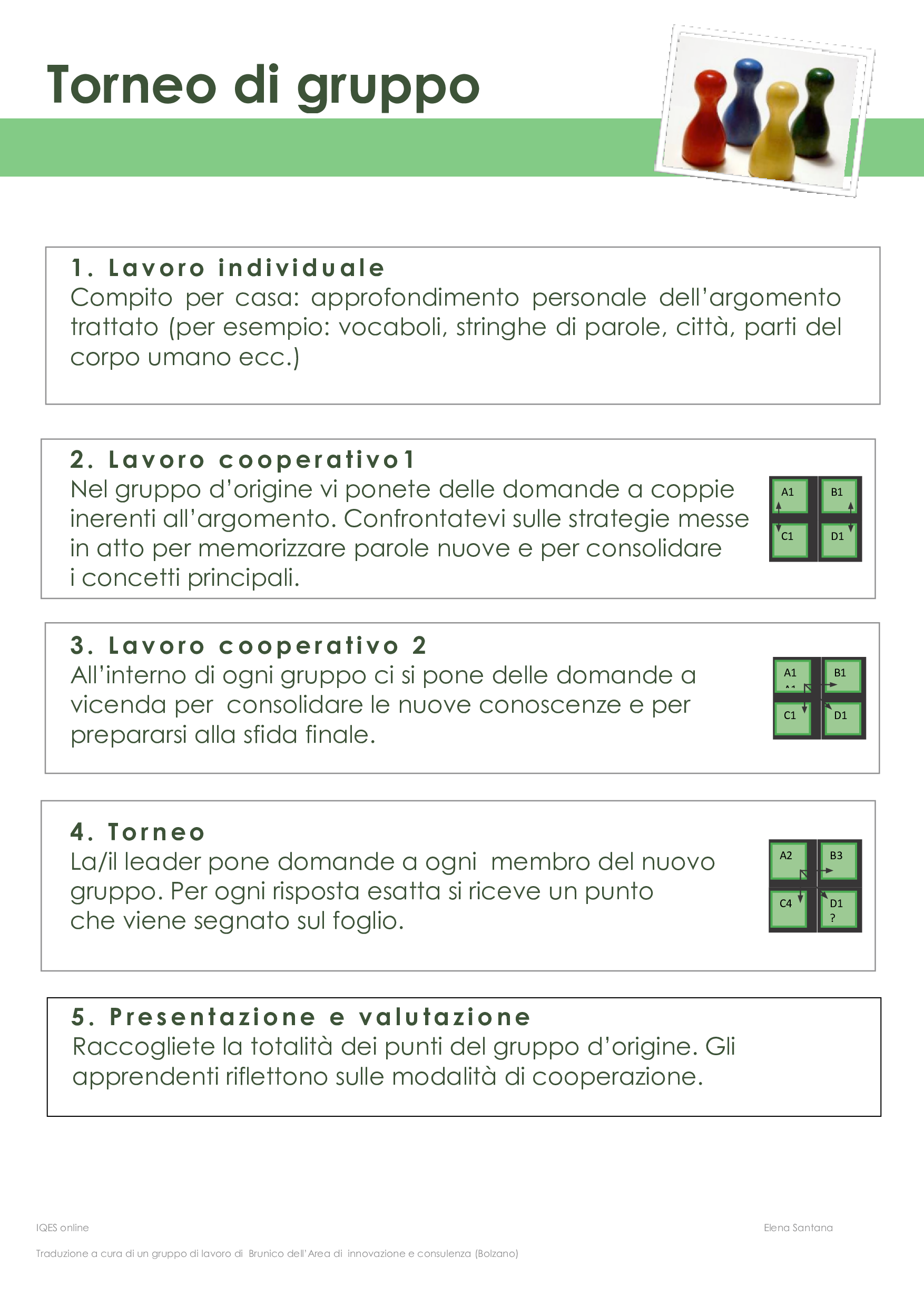 Raccolta di tipologie di attivitä in apprendimento cooperativo - Traduzione a cura di un gruppo di lavoro dell’Area di innovazione e consulenza (Bolzano): Claudia Amato, Paola Cason, Marina Fiorentini, Manuela Guzzetti, Oriana Primucci, Monika Schwingshackl, Raffaele Vaccarin