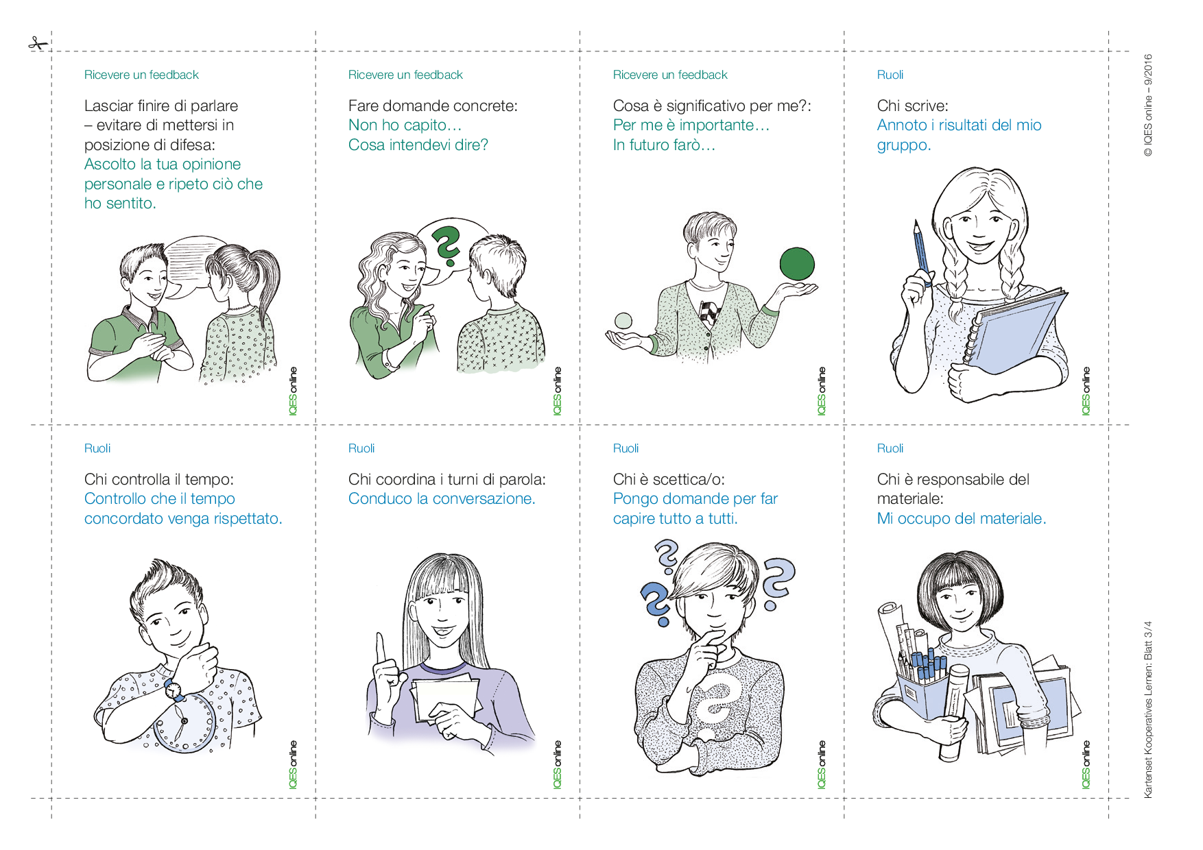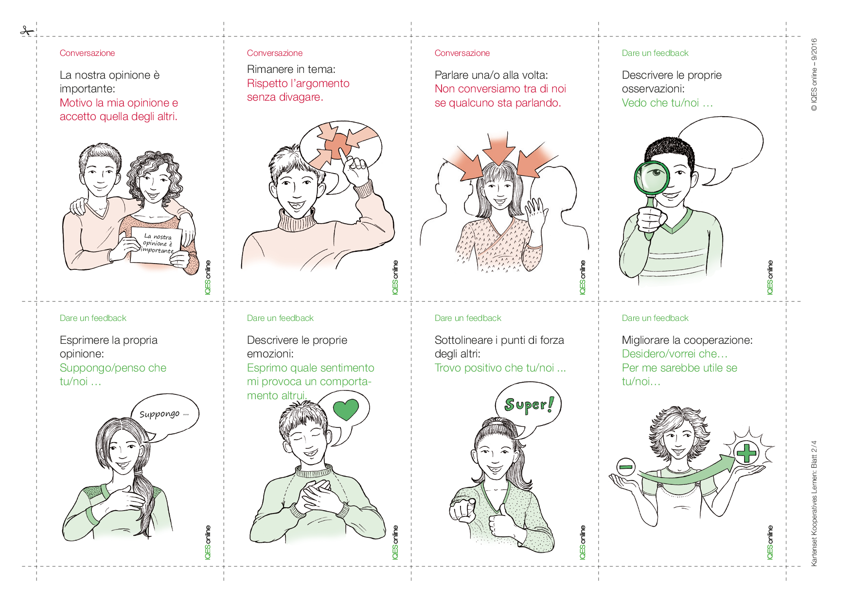 I nove cartellini per la comunicazione visualizzano e descrivono le regole più importanti per la conversazione. Gli otto cartellini del feedback illustrano delle regole facilitanti per dare un feedback. L’inizio delle frasi facilitano il modo di dare e ricevere un feedback. I tredici cartellini dei ruoli descrivono i compiti che vengono rispettati da ogni membro di un gruppo efficace.