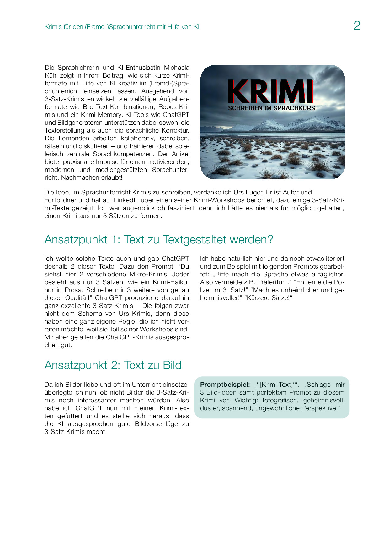 Anhand eines erprobten Unterrichtskonzepts zeigt die Autorin, wie durch die Verbindung von Mikro-Krimis, Bildimpulsen und KI-gestützten Schreibanlässen kreative Sprachproduktion gefördert werden kann. Das Format stärkt nicht nur Schreib- und Ausdruckskompetenz, sondern ermöglicht auch die gezielte Schulung digitaler und kollaborativer Fähigkeiten – motivierend, niedrigschwellig und differenzierend einsetzbar im (Fremd-)Sprachunterricht.