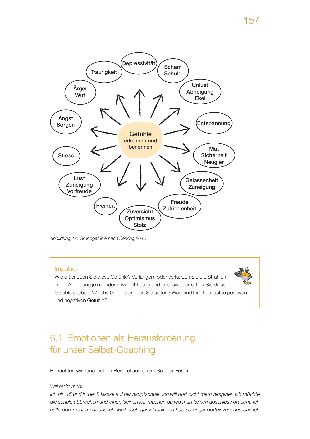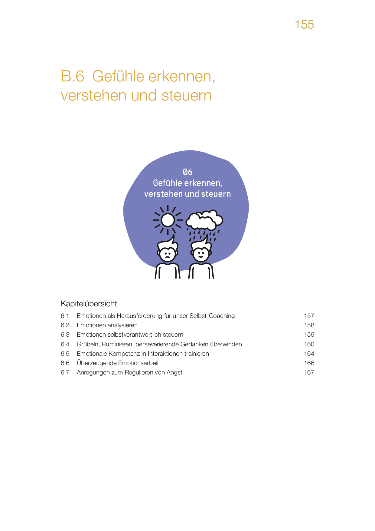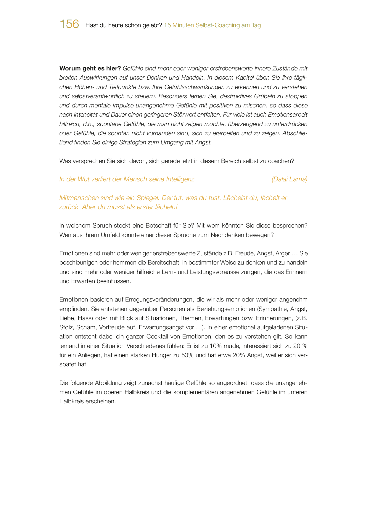 Gefühle sind mehr oder weniger erstrebenswerte innere Zustände mit breiten Auswirkungen auf unser Denken und Handeln. In diesem Kapitel üben Sie Ihre täglichen Höhen- und Tiefpunkte bzw. Ihre Gefühlsschwankungen zu erkennen und zu verstehen und selbstverantwortlich zu steuern. Besonders lernen Sie, destruktives Grübeln zu stoppen und durch mentale Impulse unangenehme Gefühle mit positiven zu mischen, so dass diese nach Intensität und Dauer einen geringeren Störwert entfalten. Abschließend finden Sie einige Strategien zum Umgang mit Angst.