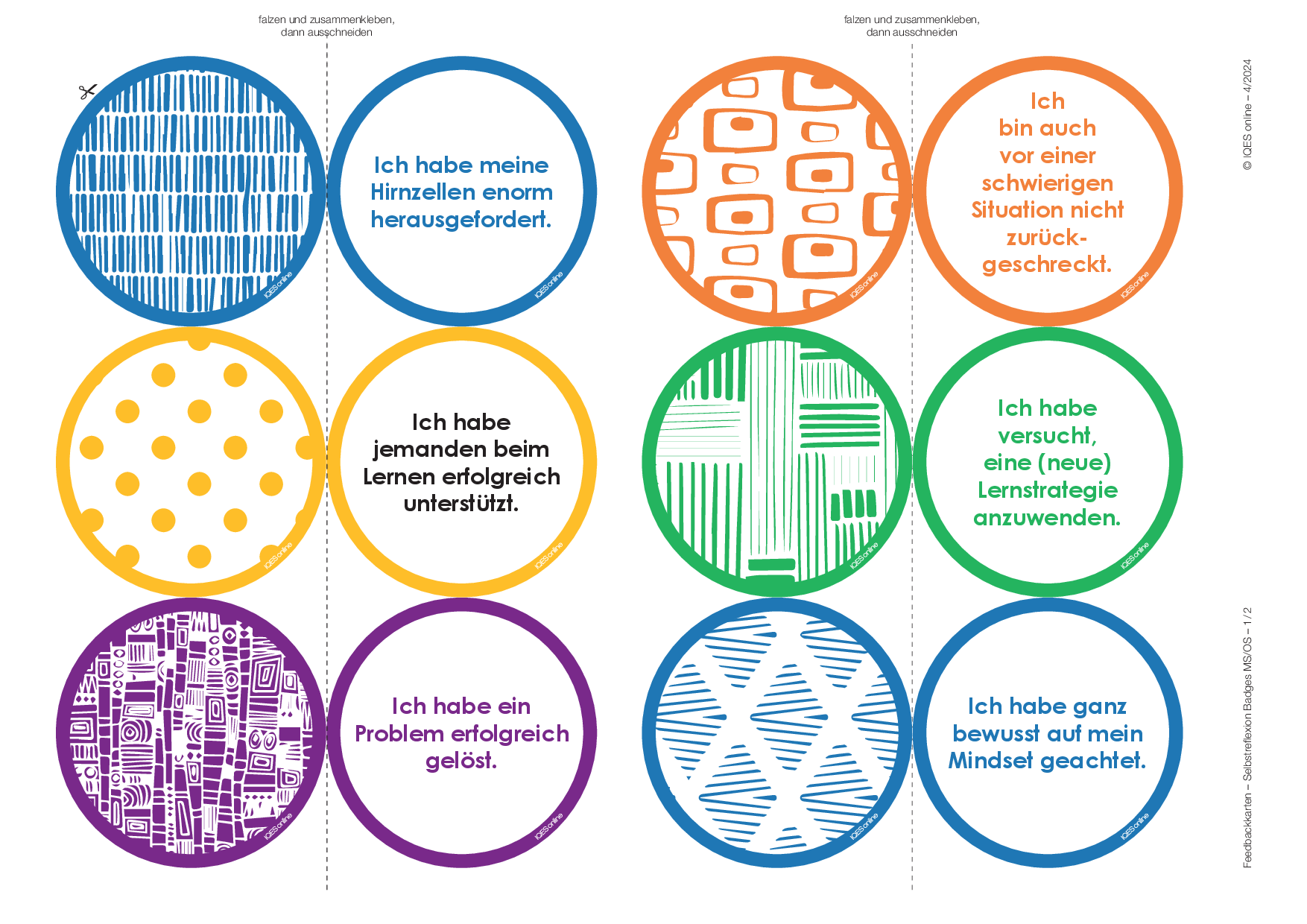Diese Feedbackkarten sind vielseitig einsetzbar: für die mündliche oder schriftliche Selbstreflexion, als Denkanstoss, Sprech- und Schreibanlass. Zudem bieten sie die Möglichkeit für Schülerinnen und Schüler ebenso wie für Lehrpersonen, alleine oder gemeinsam über das Lernen nachzudenken, den eigenen Lernprozess oder den Unterricht sichtbar werden zu lassen. Als Badges werden sie auch zu Orientierungspunkten und Begleitern für eigene Lernziele.