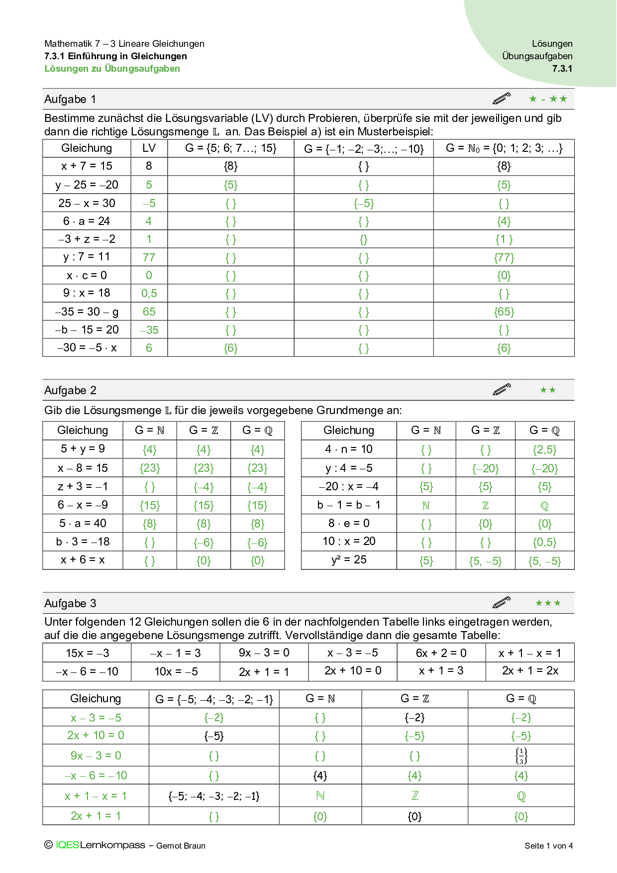 7.3 Lineare Gleichungen – Lösungen zum Aufgabenpool für Abschlusstests