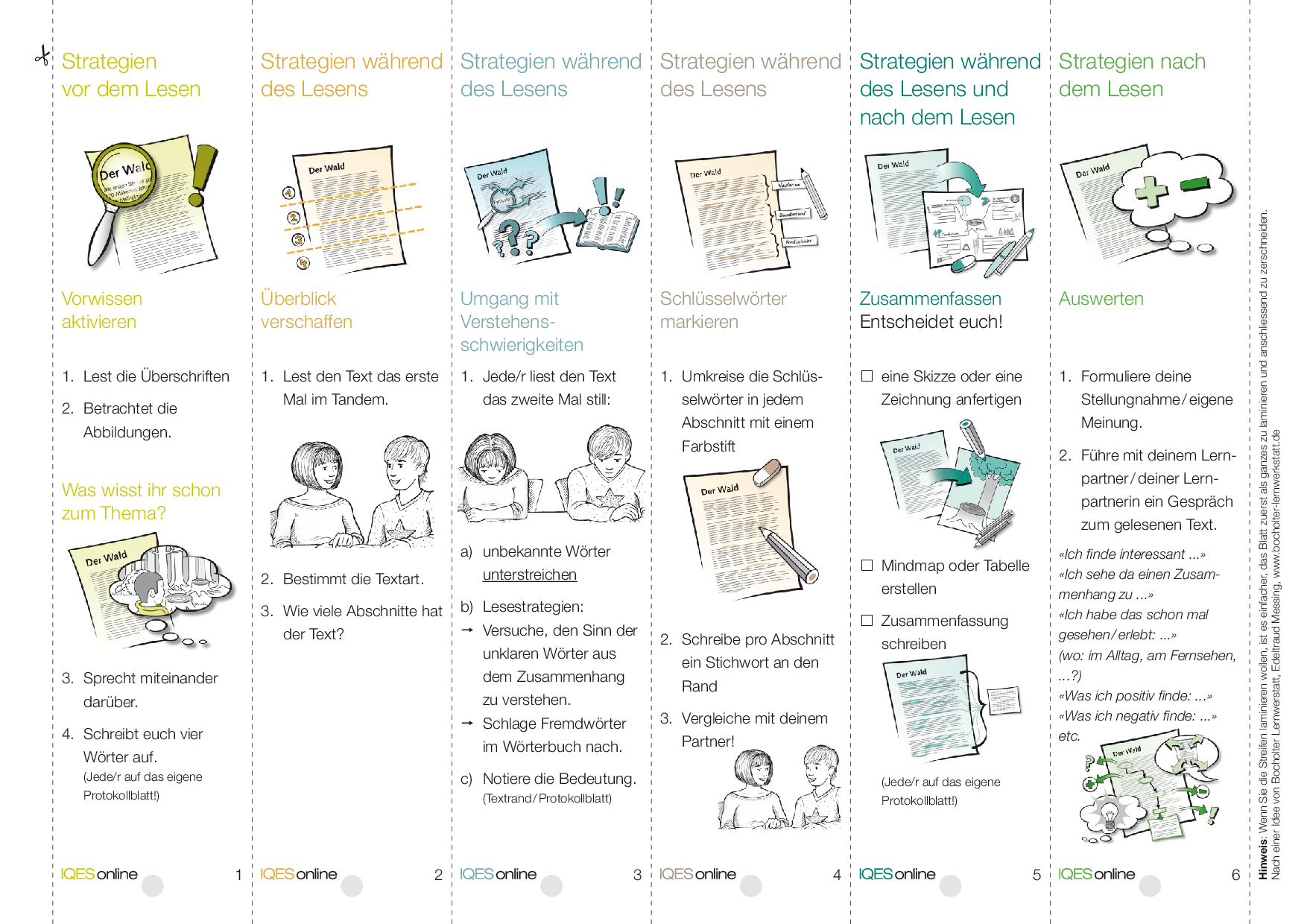 Ein hilfreiches Werkzeug für Schüler:innen: Die Fächerkarten veranschaulichen sechs Strategien, die angewendet werden können, um einen Text besser zu verstehen. Strategien vor dem Lesen (Vorwissen aktivieren), während des Lesens (Überblick verschaffen, Umgang mit Verstehensschwierigkeiten, Schlüsselwörter markieren, Zusammenfassen) und nach dem Lesen (Auswerten).