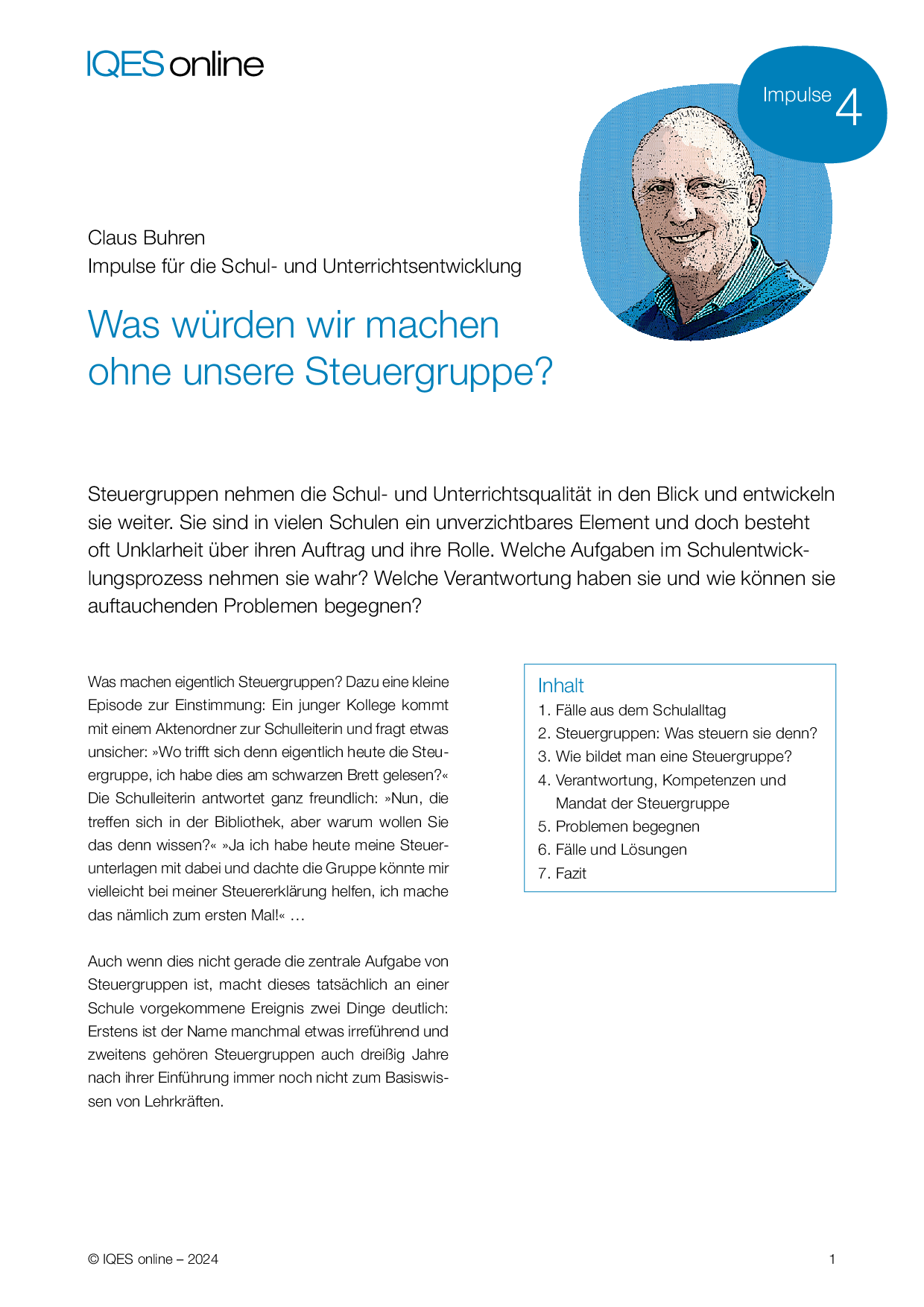 Steuergruppen nehmen die Schul- und Unterrichtsqualität in den Blick und entwickeln sie weiter. Sie sind in vielen Schulen ein unverzichtbares Element und doch besteht oft Unklarheit über ihren Auftrag und ihre Rolle. Welche Aufgaben im Schulentwicklungsprozess nehmen sie wahr? Welche Verantwortung haben sie und wie können sie auftauchenden Problemen begegnen?