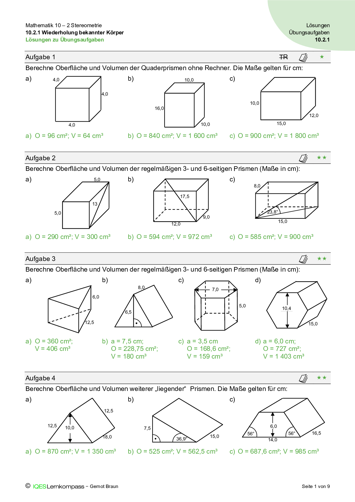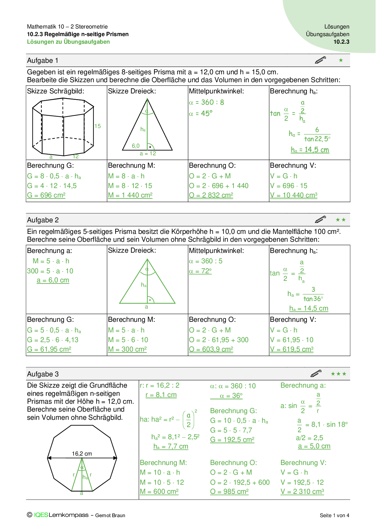 10.2.3 Regelmässige n-seitige Prismen Lösungen zu Übungsaufgaben