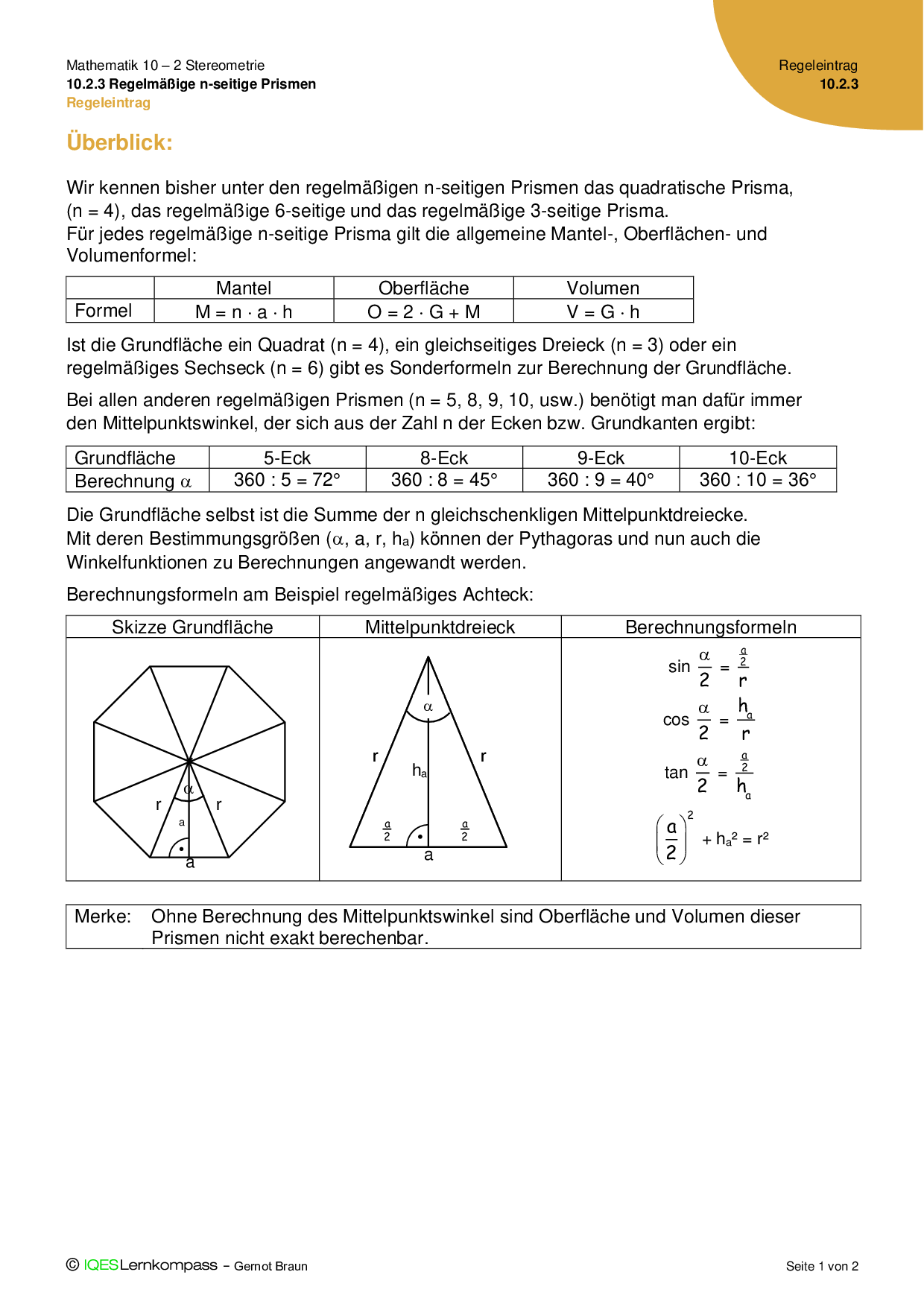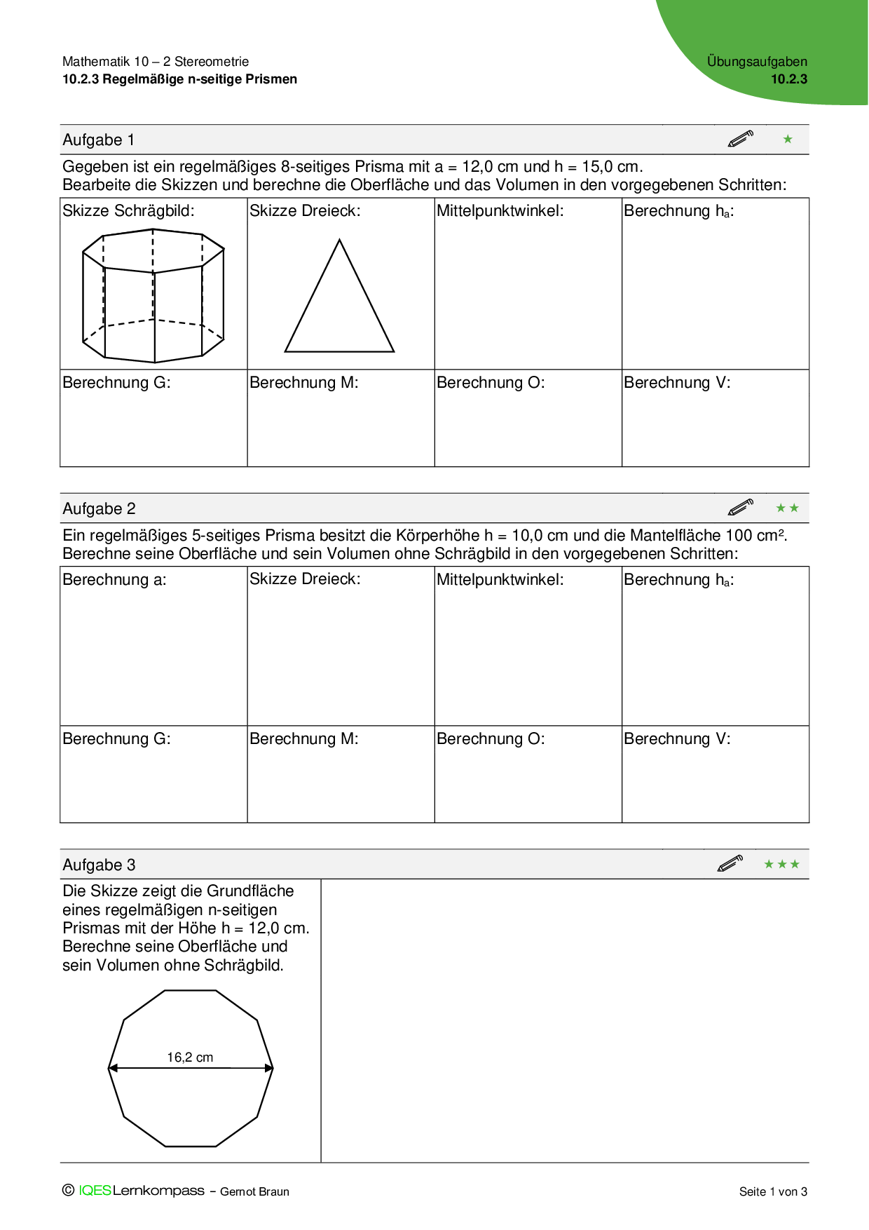 10.2.3 Regelmässige n-seitige Prismen Übungsaufgaben