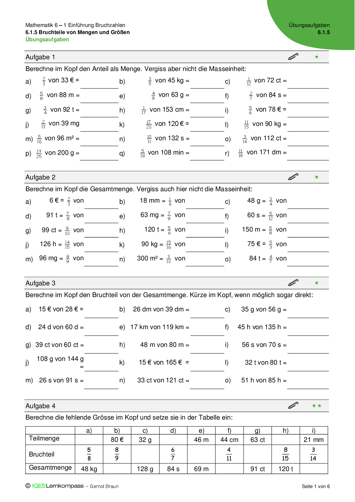 6.1.5 Bruchteile von Mengen und Grössen – Übungsaufgaben mit Lösungen