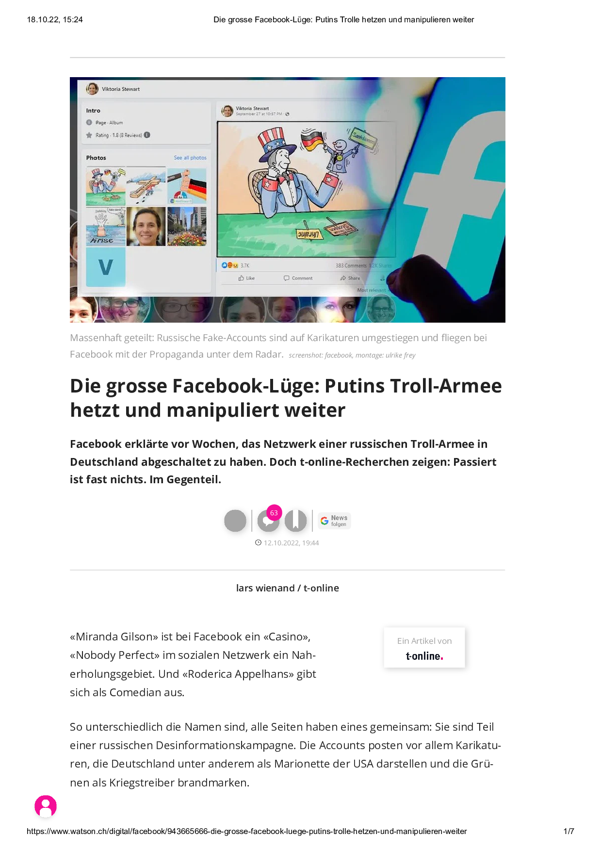 «Die grosse Facebook-Lüge: Putins Troll-Armee hetzt und manipuliert weiter» (Watson)