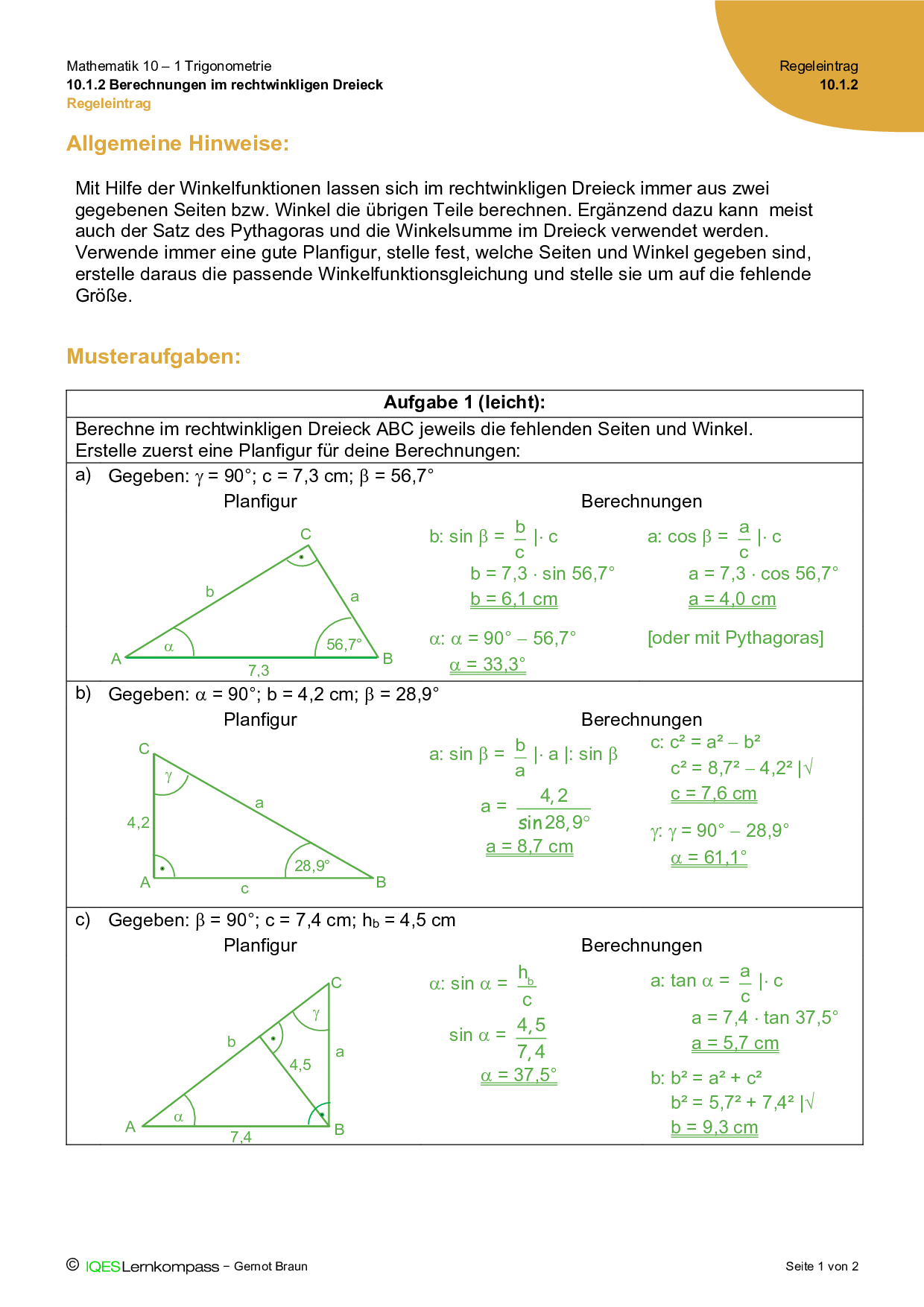10.1.2 Berechnungen im rechtwinkligen Dreieck Regeleintrag