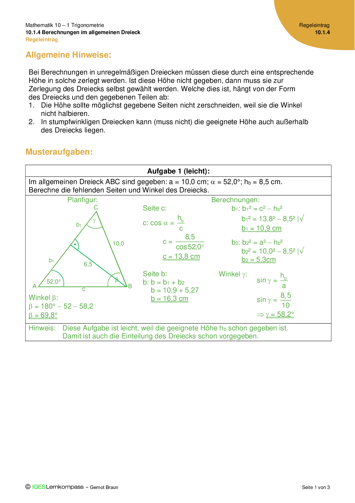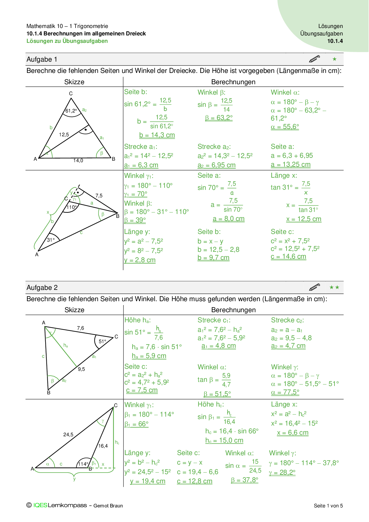 10.1.4 Berechnungen im allgemeinen Dreieck Lösungen zu Übungsaufgaben