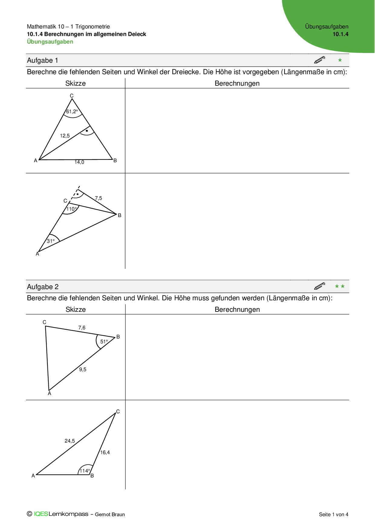 10.1.4 Berechnungen im allgemeinen Dreieck Übungsaufgaben