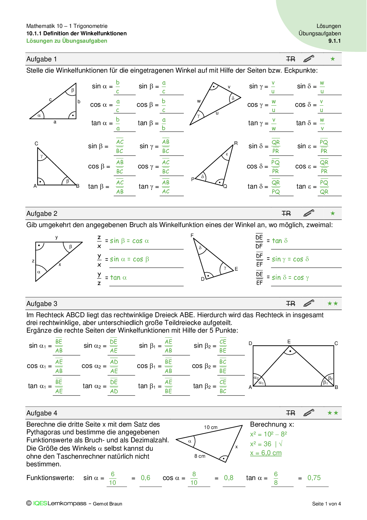 10.1.2 Berechnungen im rechtwinkligen Dreieck Lösungen zu Übungsaufgaben