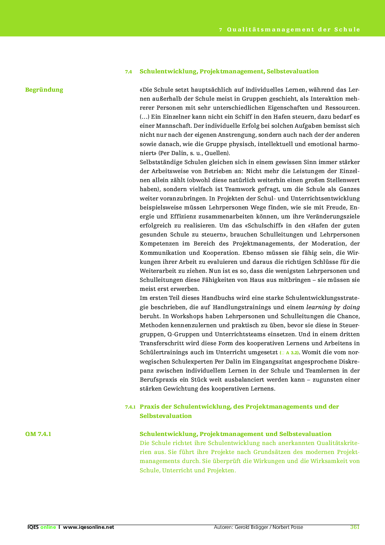 7.4 Schulentwicklung, Projektmanagement, Selbstevaluation