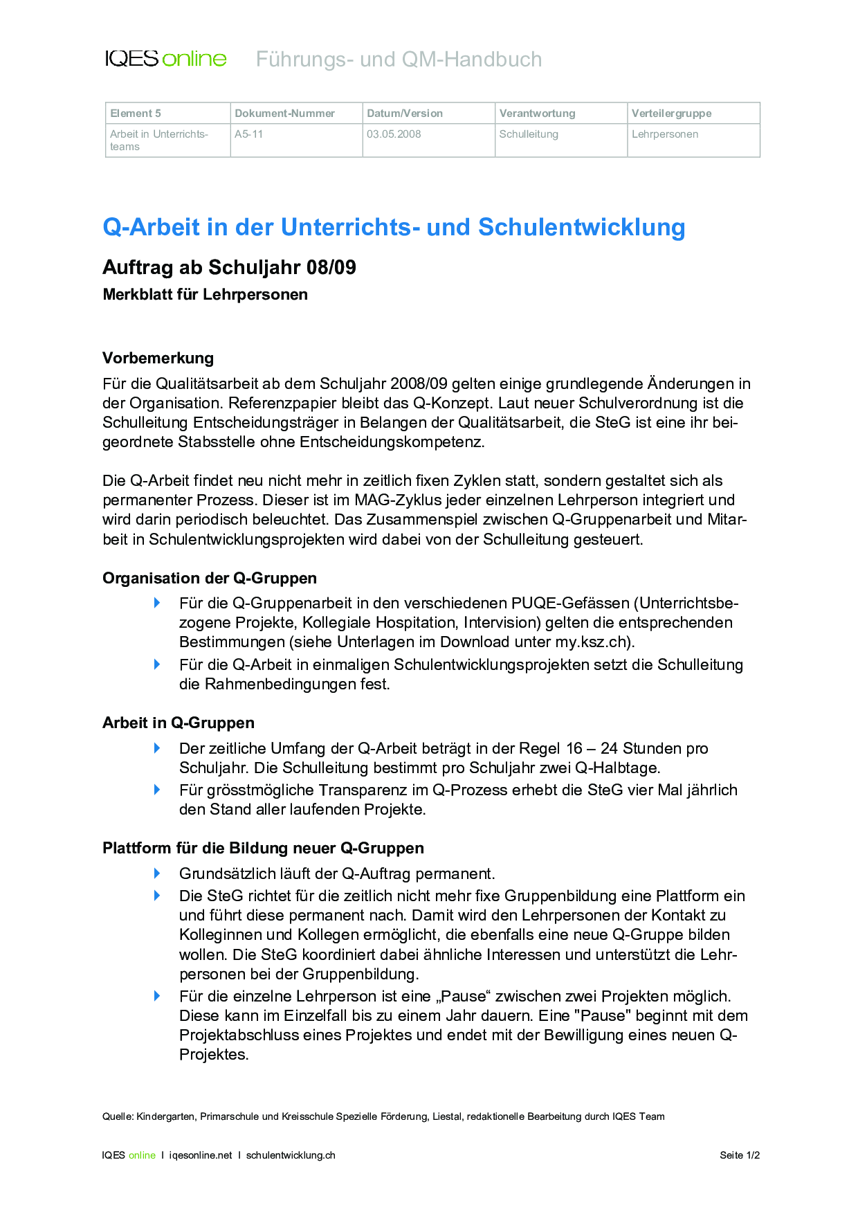 Der Auftrag für die Q-Arbeit in der Unterrichts- und Schulentwicklung wird ausgeführt. Dabei gelten für die Qualitätsarbeit ab dem Schuljahr 2008/09 einige grundlegende Änderungen in der Organisation.