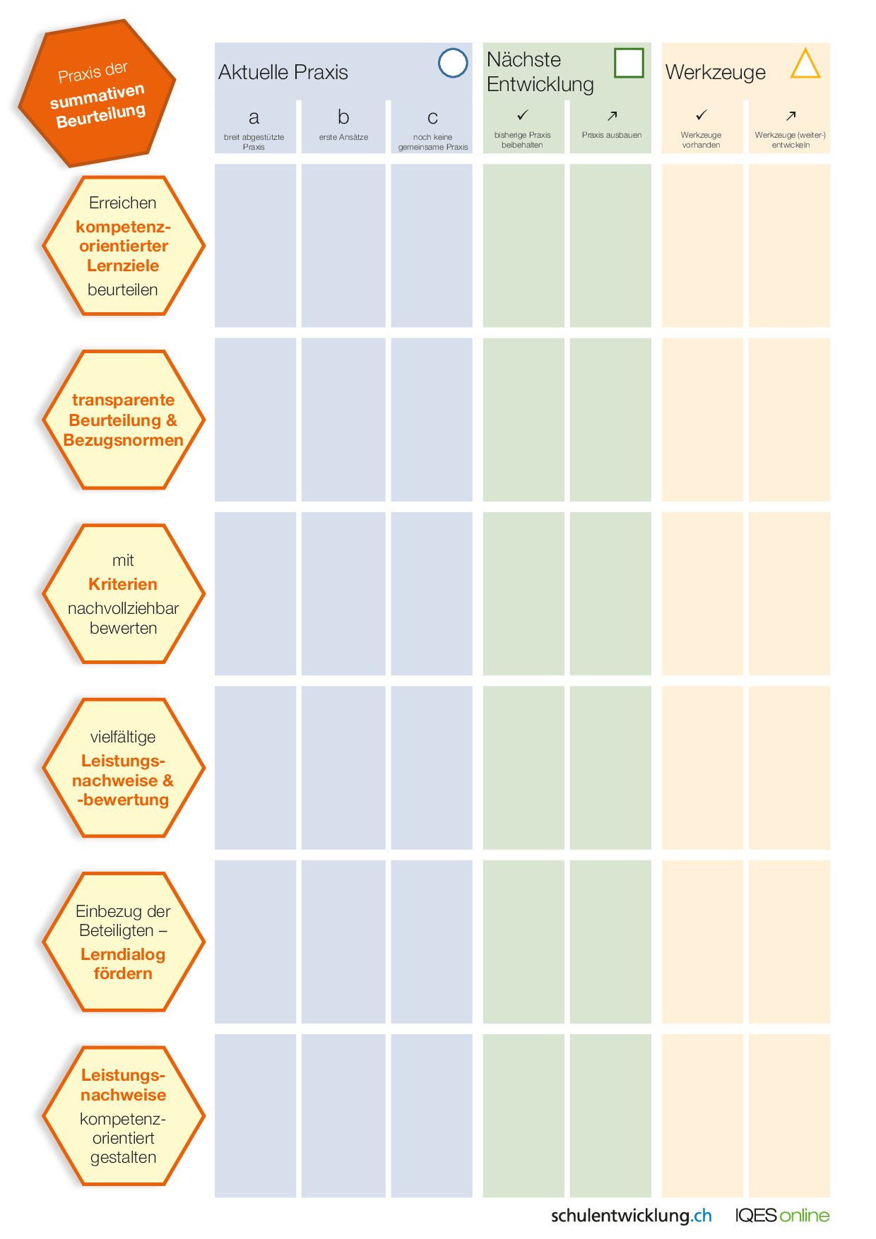 Die Teilnehmenden schätzen zuerst in Einzelarbeit die Praxis der summativen Bewertung ein. Sie überlegen sich, welches die nächsten Entwicklungsschritte in den sechs Bausteinen sein können. Danach werden die Einzeleinschätzungen mit Moderationspunkten auf ein Plakat übertragen oder mit einer Online-Befragung erhoben. In der anschließenden kollegialen Diskussion werden Ziele geklärt und Entwicklungsschwerpunkte vereinbart.