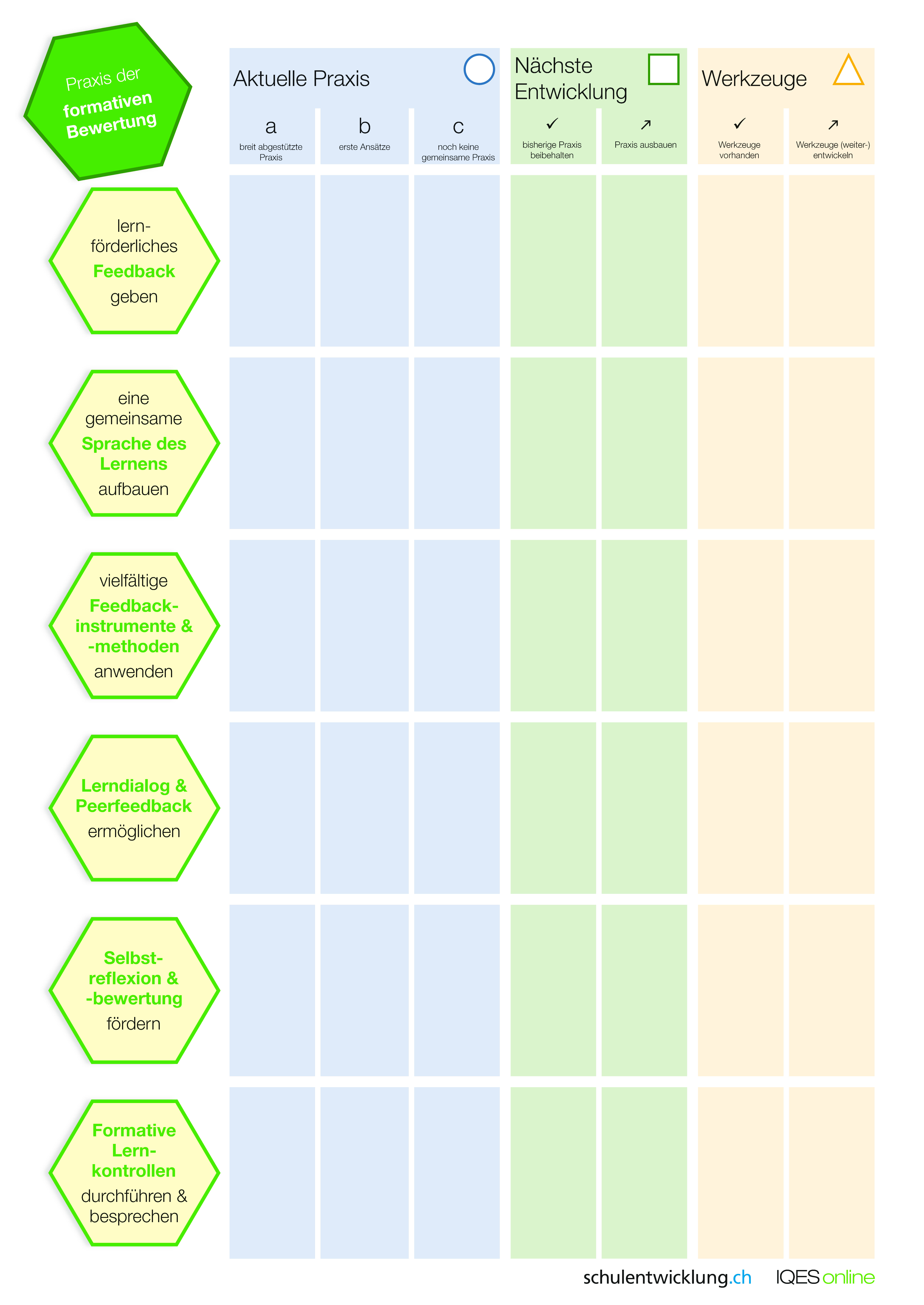 Die Teilnehmenden schätzen zuerst in Einzelarbeit die Praxis der formativen Bewertung ein. Sie überlegen sich, welches die nächsten Entwicklungsschritte in den sechs Bausteinen sein können. Danach werden die Einzeleinschätzungen mit Moderationspunkten auf ein Plakat übertragen oder mit einer Online-Befragung erhoben. In der anschließenden kollegialen Diskussion werden Ziele geklärt und Entwicklungsschwerpunkte vereinbart.
