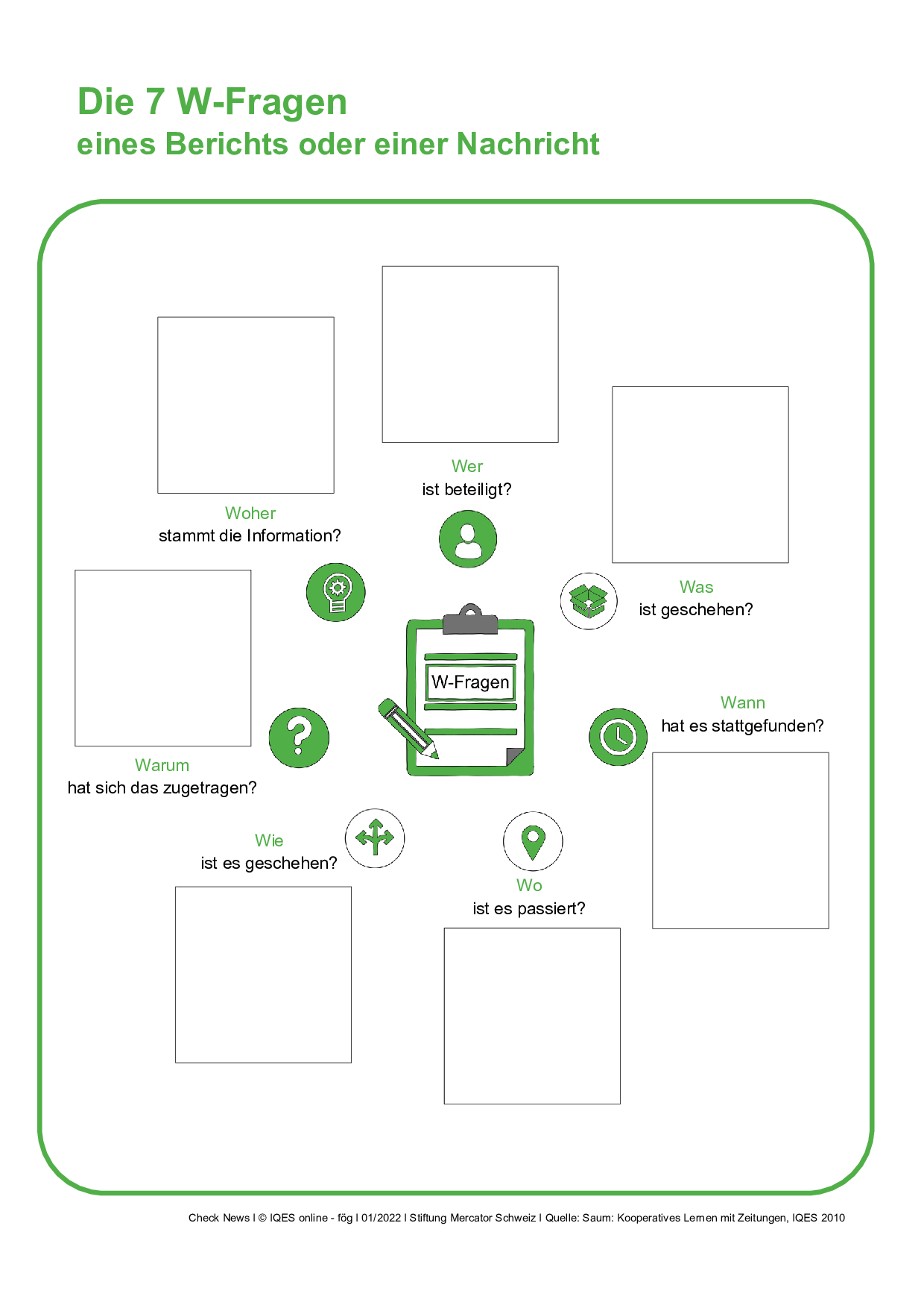 Ein Arbeitsblatt «7-W-Fragen» zu CheckNews-Lernumgebungen: «Berichte kritisch lesen», «Video-Stories analysieren».