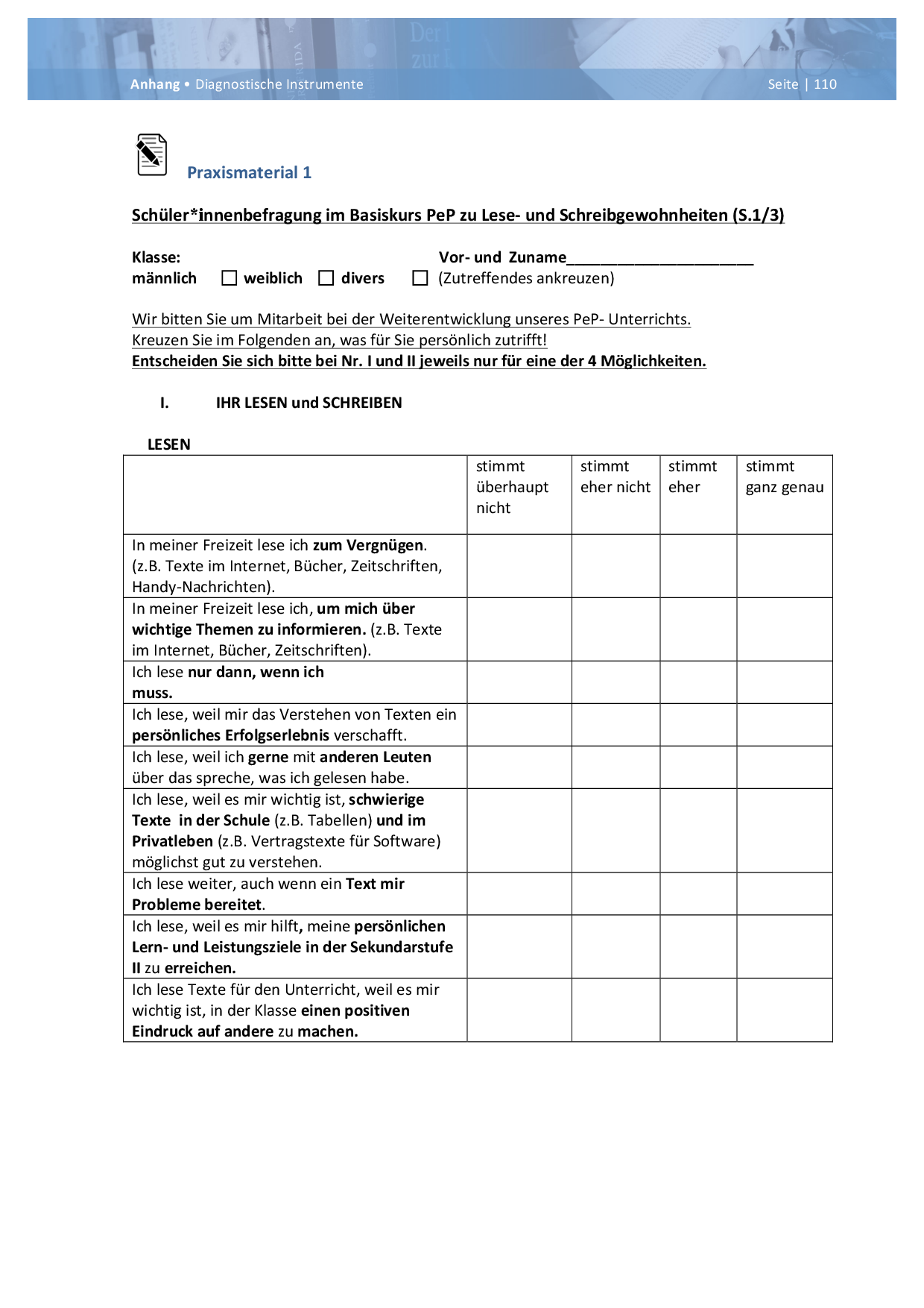 Fragebogen für die schulinterne Evaluation des PeP-Basiskurses zur Förderung der Lese- und Schreibkompetenzen in allen Fächern.