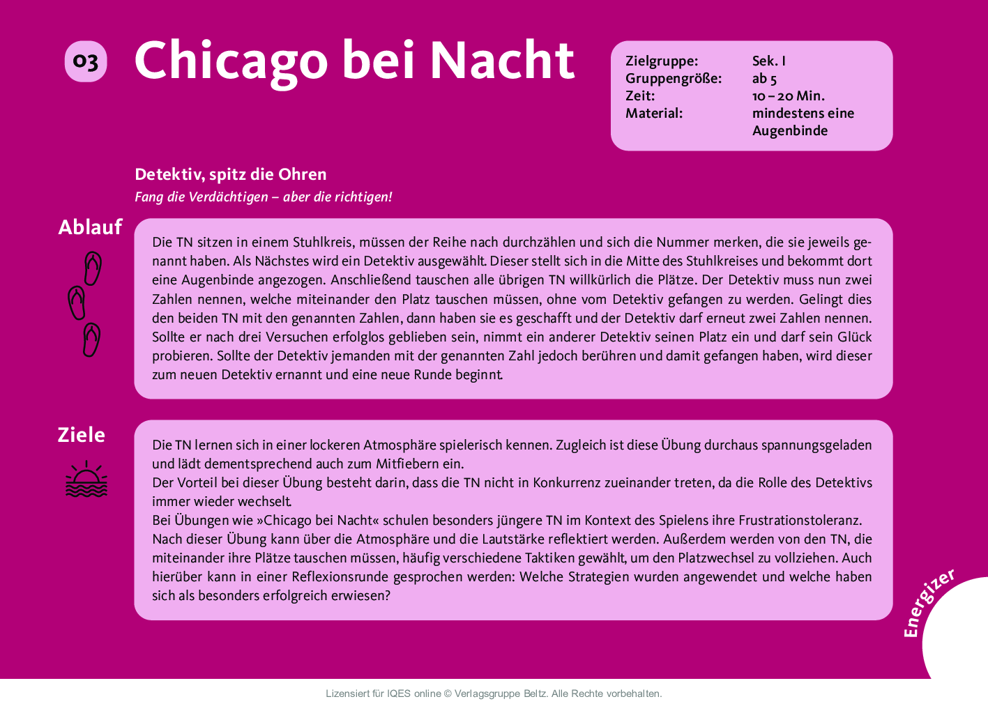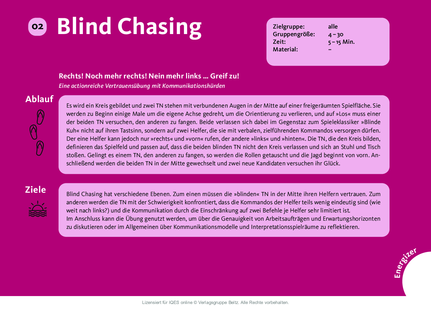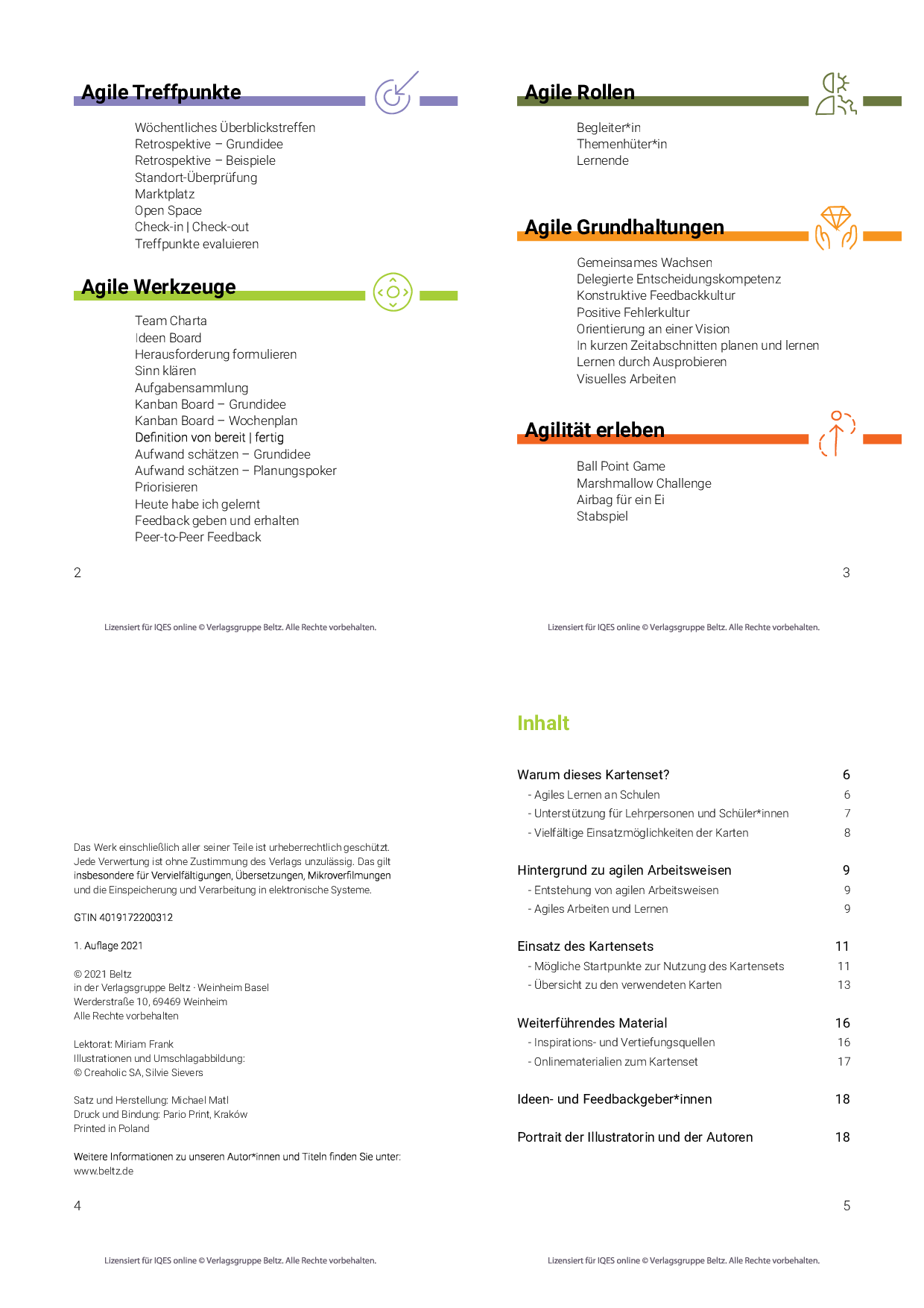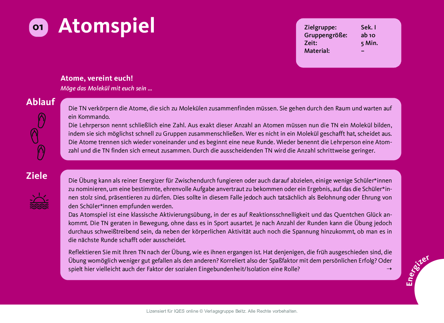 45 Karten mit Energizern, erlebnispädagogischen Methoden und systemischen Fragetechniken und Reflexionsmethoden. Das dazugehörige Booklet vermittelt Hintergrundinformationen, Empfehlungen zum Einsatz und Grundsätze der systemischen Beratung.
