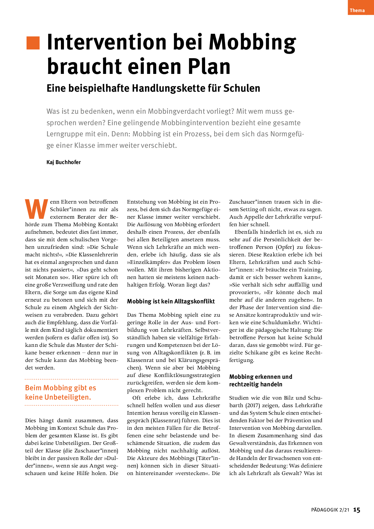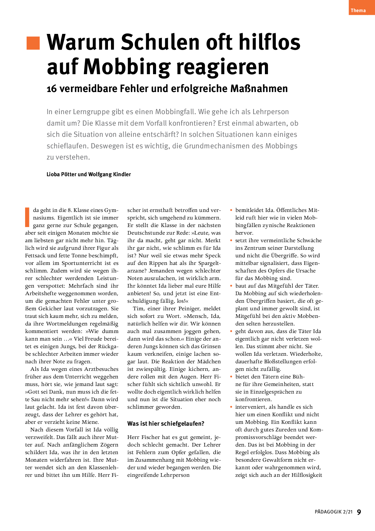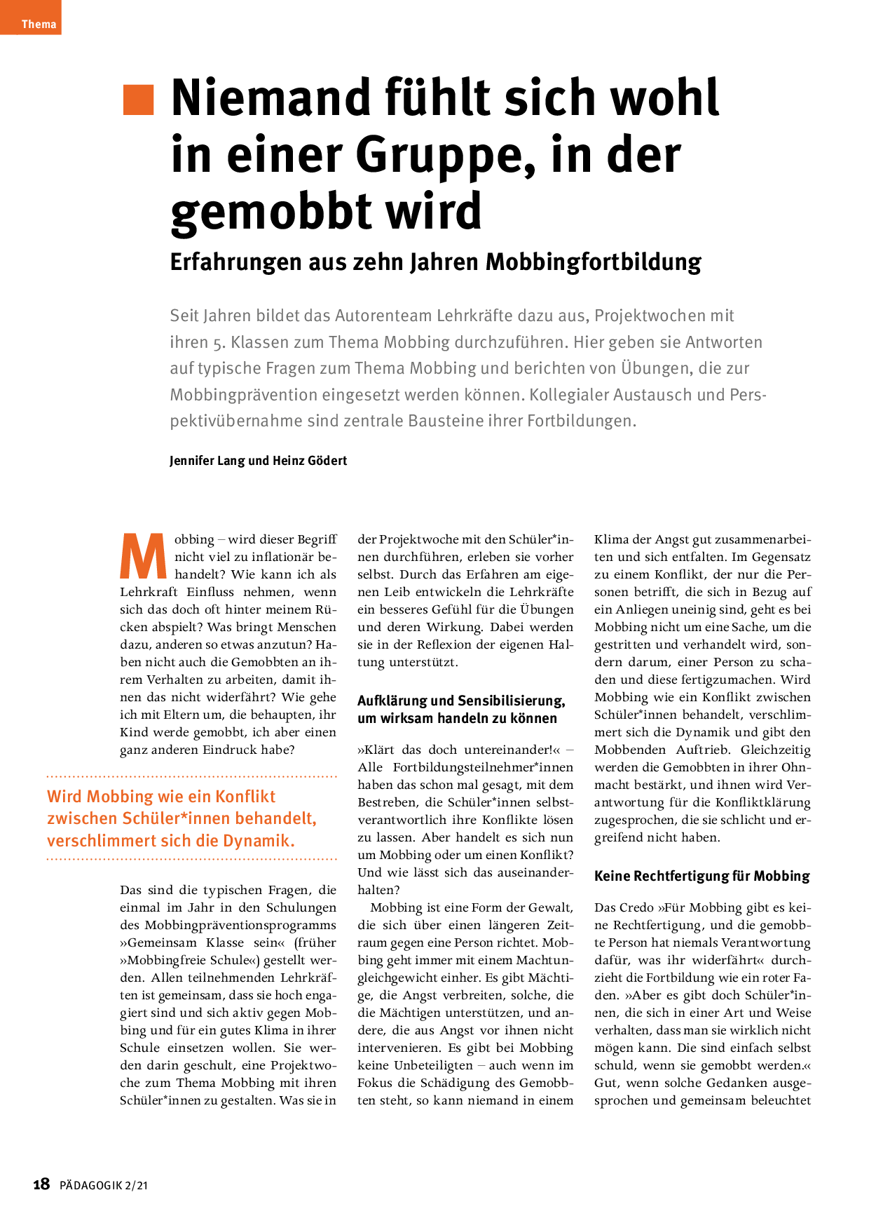 Seit Jahren bildet das Autorenteam Lehrkräfte dazu aus, Projektwochen mit ihren 5. Klassen zum Thema Mobbing durchzuführen. Hier geben sie Antworten auf typische Fragen zum Thema Mobbing und berichten von Übungen, die zur Mobbingprävention eingesetzt werden können. Kollegialer Austausch und Perspektivübernahme sind zentrale Bausteine ihrer Fortbildungen.