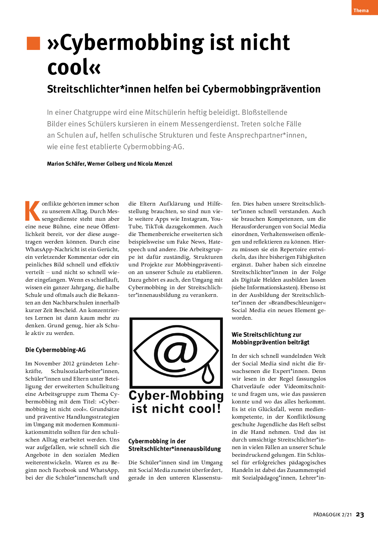In einer Chatgruppe wird eine Mitschülerin heftig beleidigt. Bloßstellende Bilder eines Schülers kursieren in einem Messengerdienst. Treten solche Fälle an Schulen auf, helfen schulische Strukturen und feste Ansprechpartner*innen, wie eine fest etablierte Cybermobbing-AG.