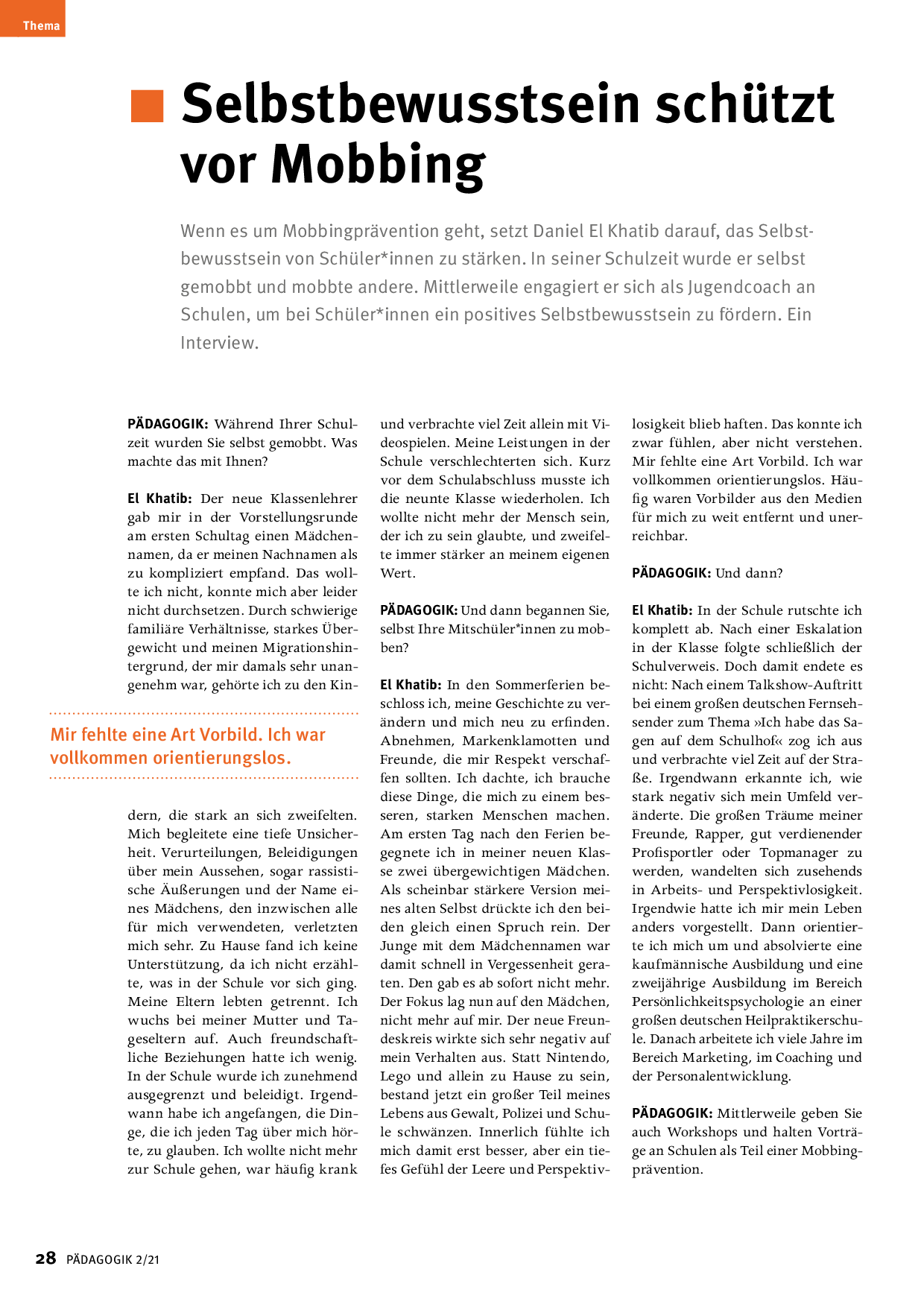 Wenn es um Mobbingprävention geht, setzt Daniel El Khatib darauf, das Selbstbewusstsein von Schüler*innen zu stärken. In seiner Schulzeit wurde er selbst gemobbt und mobbte andere. Mittlerweile engagiert er sich als Jugendcoach an Schulen, um bei Schüler*innen ein positives Selbstbewusstsein zu fördern. Ein Interview.