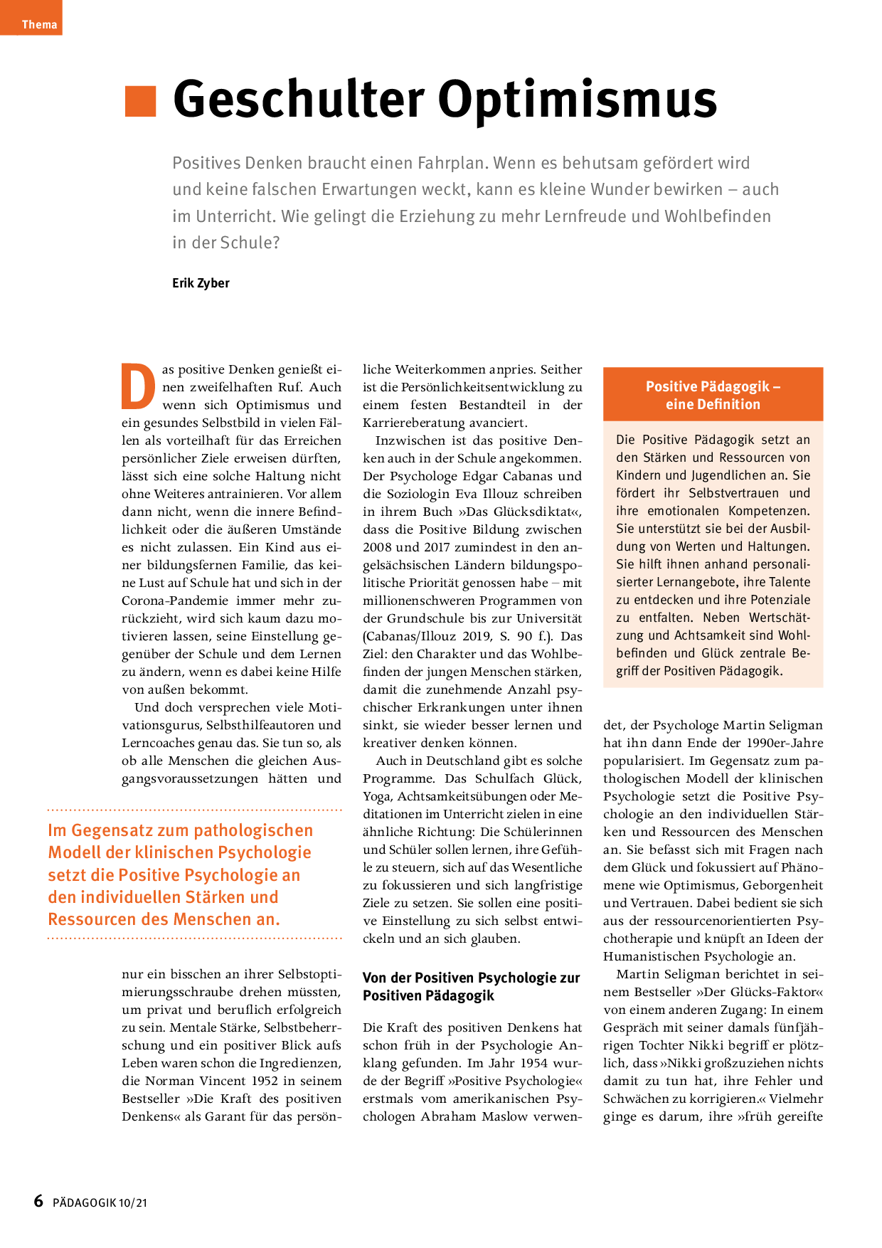 Positives Denken braucht einen Fahrplan. Wenn es behutsam gefördert wird und keine falschen Erwartungen weckt, kann es kleine Wunder bewirken – auch im Unterricht. Wie gelingt die Erziehung zu mehr Lernfreude und Wohlbefinden in der Schule?