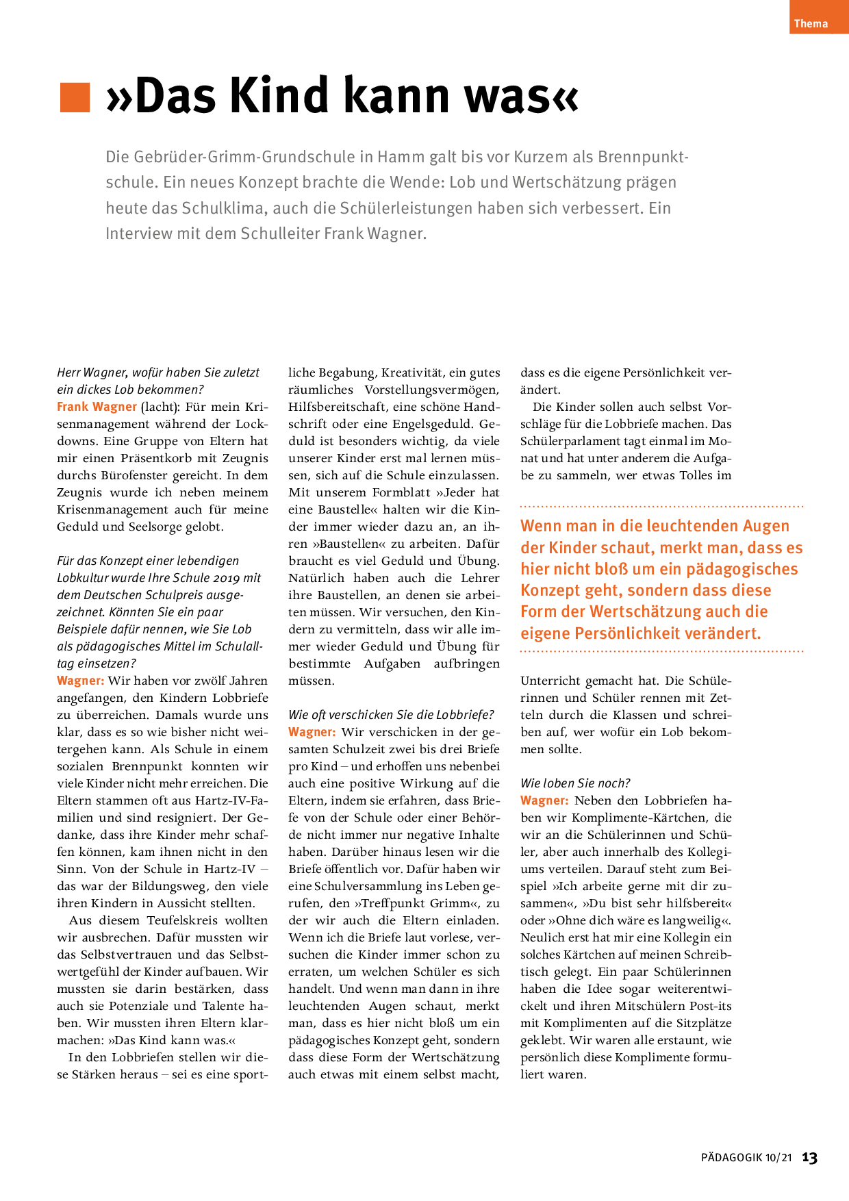 Die Gebrüder-Grimm-Grundschule in Hamm galt bis vor Kurzem als Brennpunktschule. Ein neues Konzept brachte die Wende: Lob und Wertschätzung prägen heute das Schulklima, auch die Schülerleistungen haben sich verbessert. Ein Interview mit dem Schulleiter Frank Wagner.