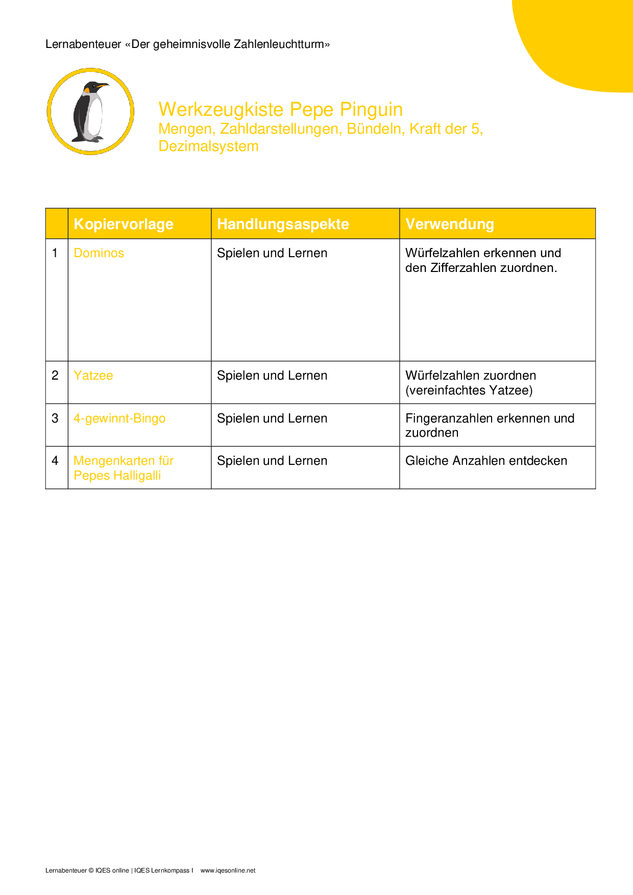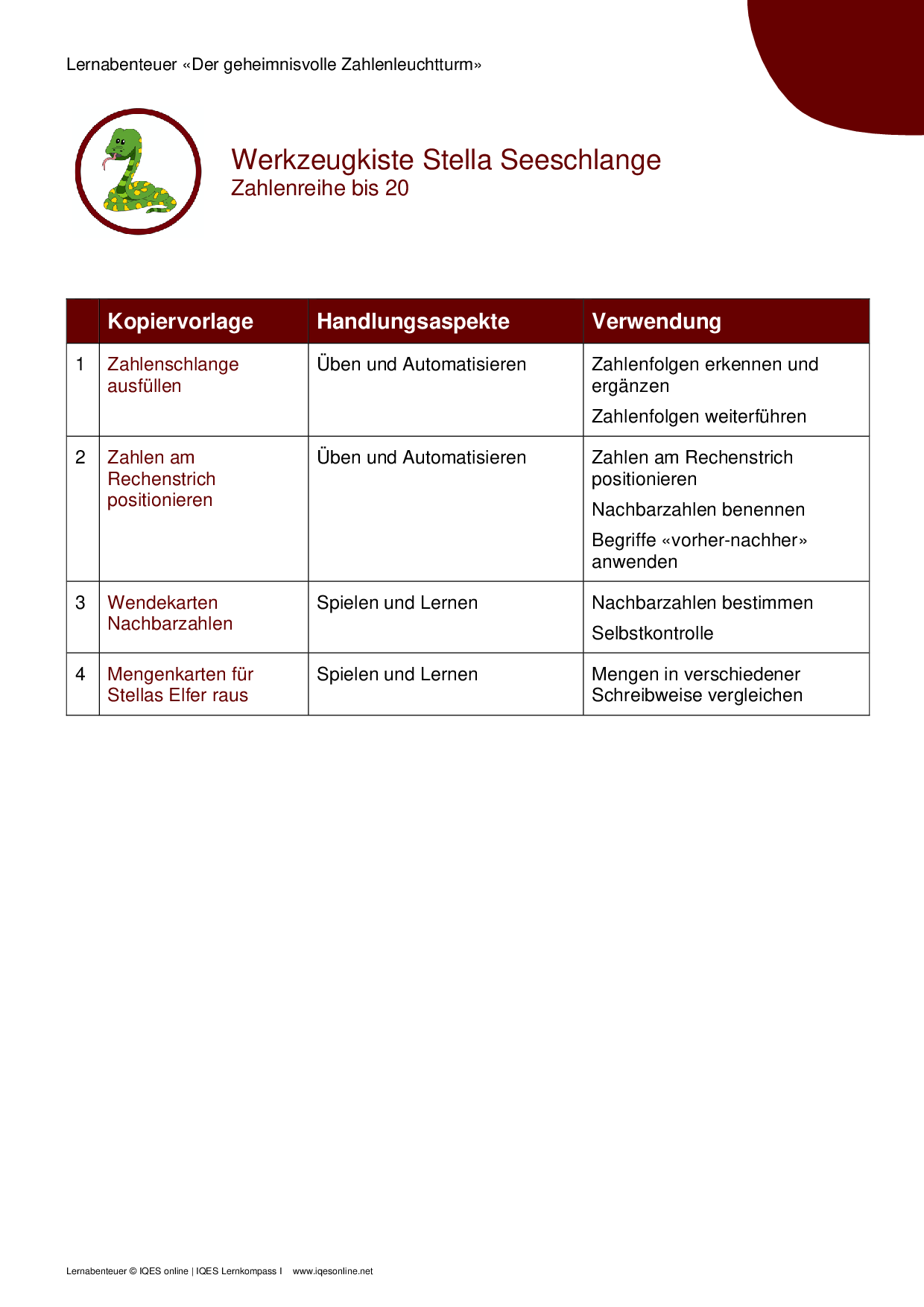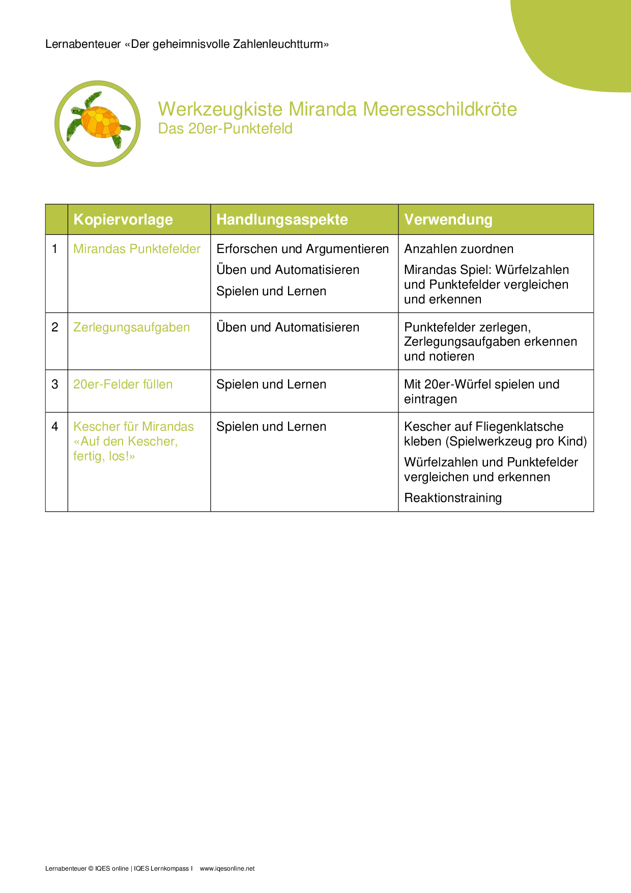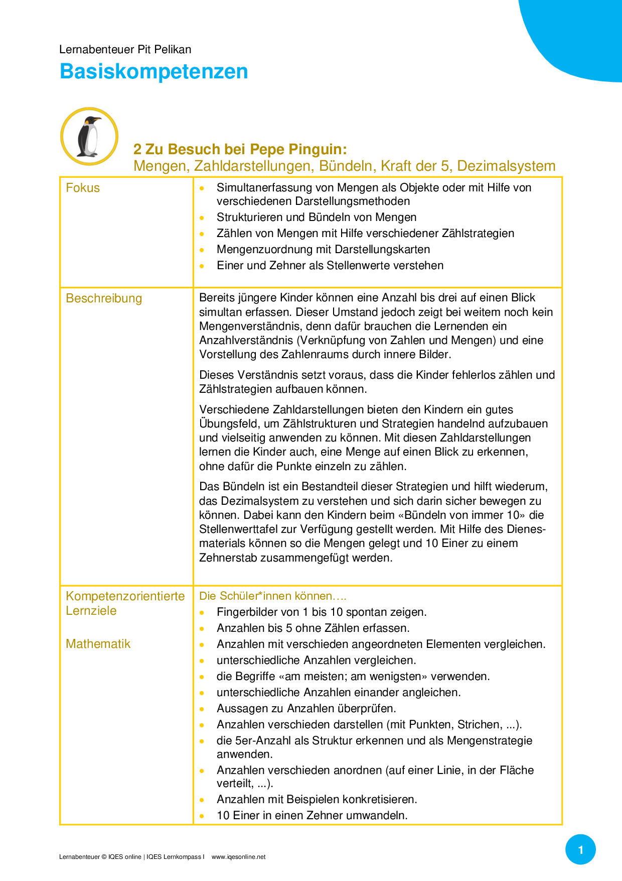 • Simultanerfassung von Mengen als Objekte oder mit Hilfe von verschiedenen Darstellungsmethoden • Strukturieren und Bündeln von Mengen • Zählen von Mengen mit Hilfe verschiedener Zählstrategien • Mengenzuordnung mit Darstellungskarten • Einer und Zehner als Stellenwerte verstehen