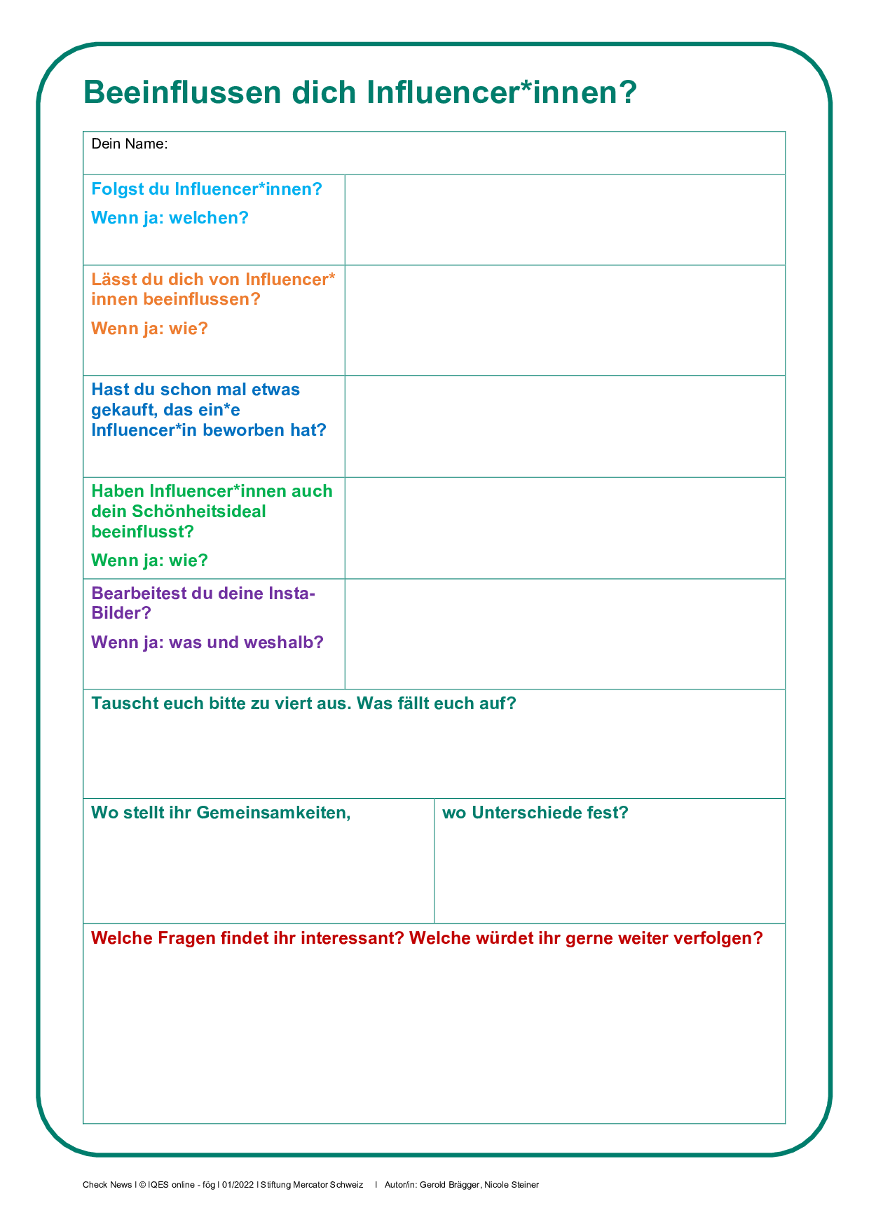 Stelle dir vor, du wirst auf der Straße von Journalist*innen befragt: Bitte beantworte die Fragen auf dem Blatt «Beeinflussen dich Influencer*innen?» zuerst für dich allein.