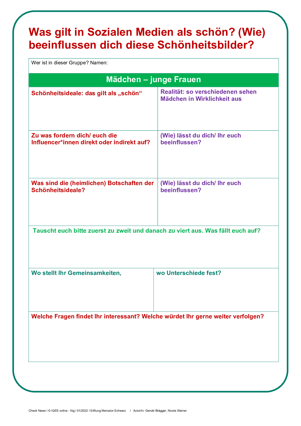 Nimm dir Zeit für dich: Bitte beantworte die Fragen auf dem «Schönheitsbilder-Blatt» zuerst für dich allein und mache dir auf dem Blatt Notizen für den Austausch mit Anderen.
