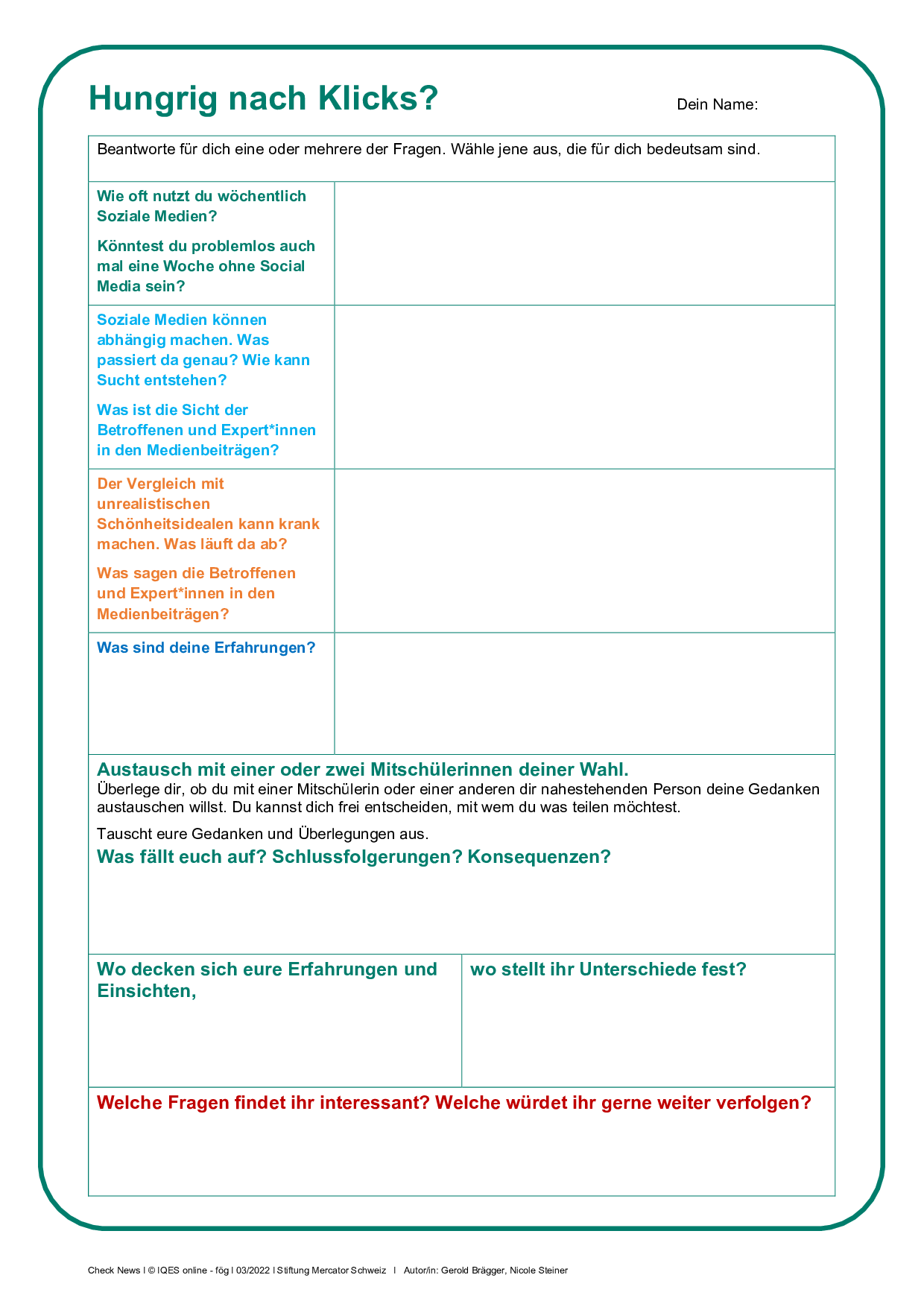 Deine persönliche Reflexion: Bitte beantworte für dich eine oder mehrere der Fragen aus dem Reflexion-Blatt «Hungrig nach Klicks?».