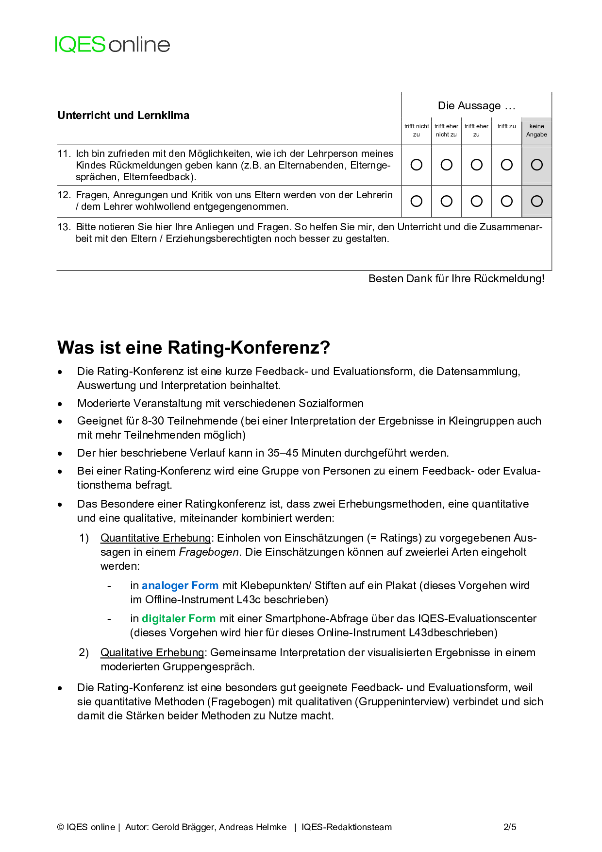 Das Instrument L43d liegt im Evaluationscenter als Online-Fragebogen vor. Die Teilnehmenden geben Ihre individuelle Einschätzung über Computer, Tablet oder Smartphone ein. Anschliessend werden die Ergebnisse in einem moderierten Gruppengespräch interpretiert. Dieses Dokument beschreibt, wie Sie die Ratingkonferenz vorbereiten und durchführen.