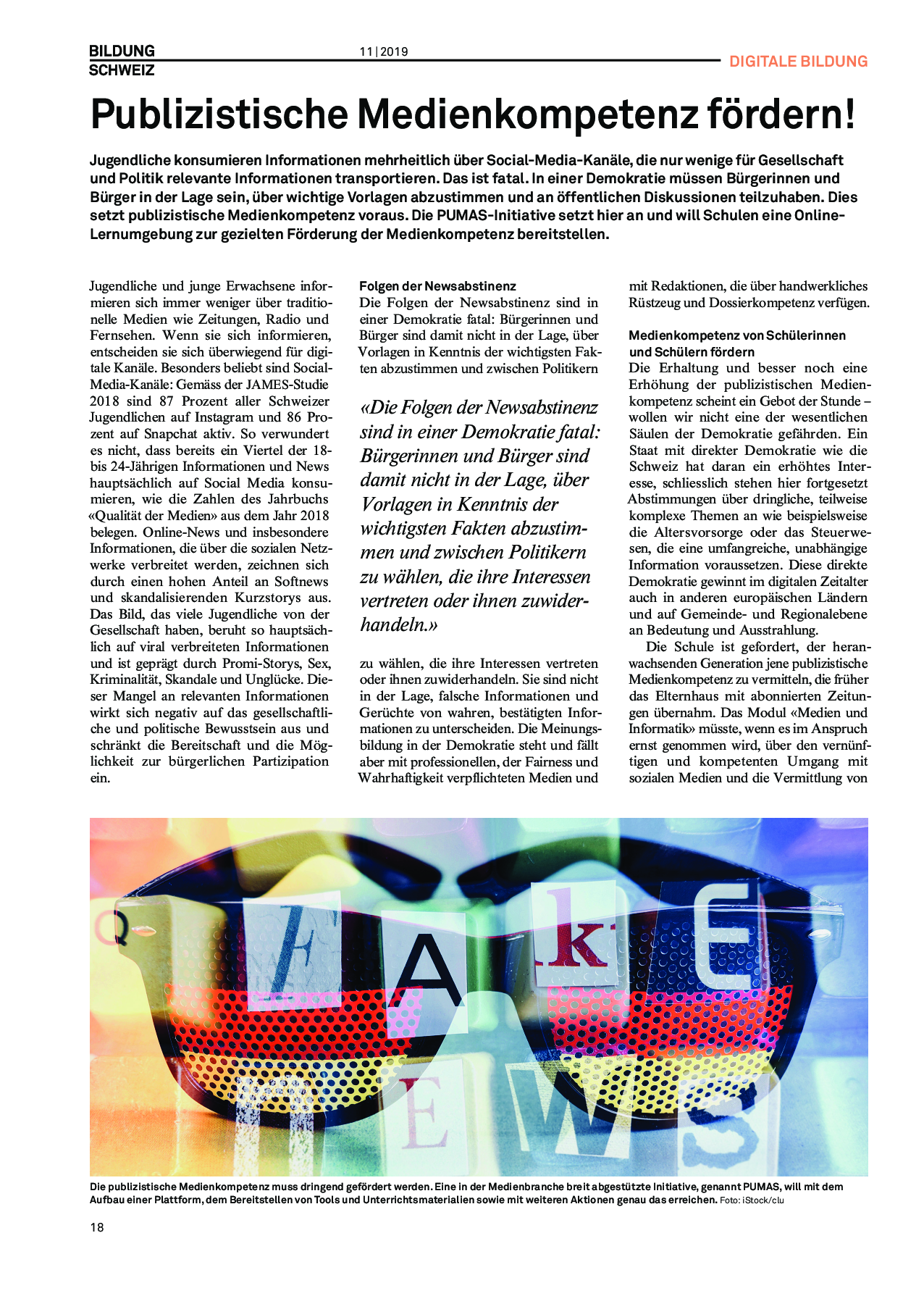 Jugendliche konsumieren Informationen mehrheitlich über Social-Media-Kanäle, die nur wenige für Gesellschaft und Politik relevante Informationen transportieren. Das ist fatal. In einer Demokratie müssen Bürgerinnen und Bürger in der Lage sein, über wichtige Vorlagen abzustimmen und an öffentlichen Diskussionen teilzuhaben. Dies setzt publizistische Medienkompetenz voraus. Die PUMAS-Initiative setzt hier an und will Schulen eine Online- Lernumgebung zur gezielten Förderung der Medienkompetenz bereitstellen.
