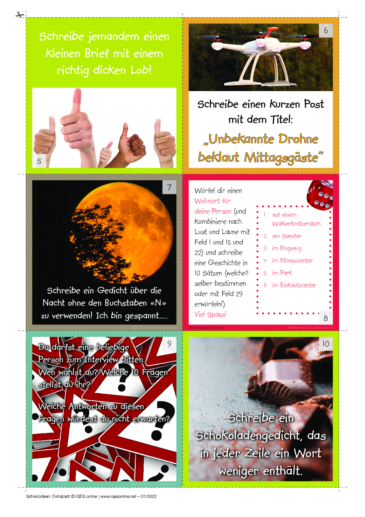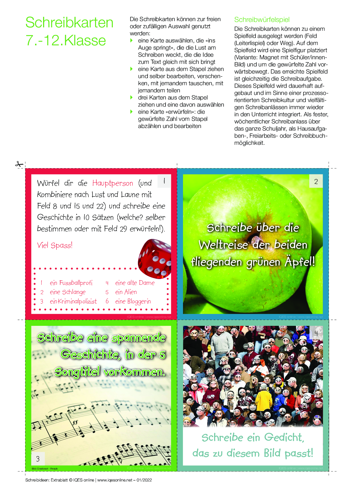 Die 45 Schreibideen für die 7.-12. Klasse sind das Pendant zu den Karten für Jüngere und bieten motivierende und fantasieanregende, kurze Schreibanlässe, die analog oder digital umgesetzt werden können.