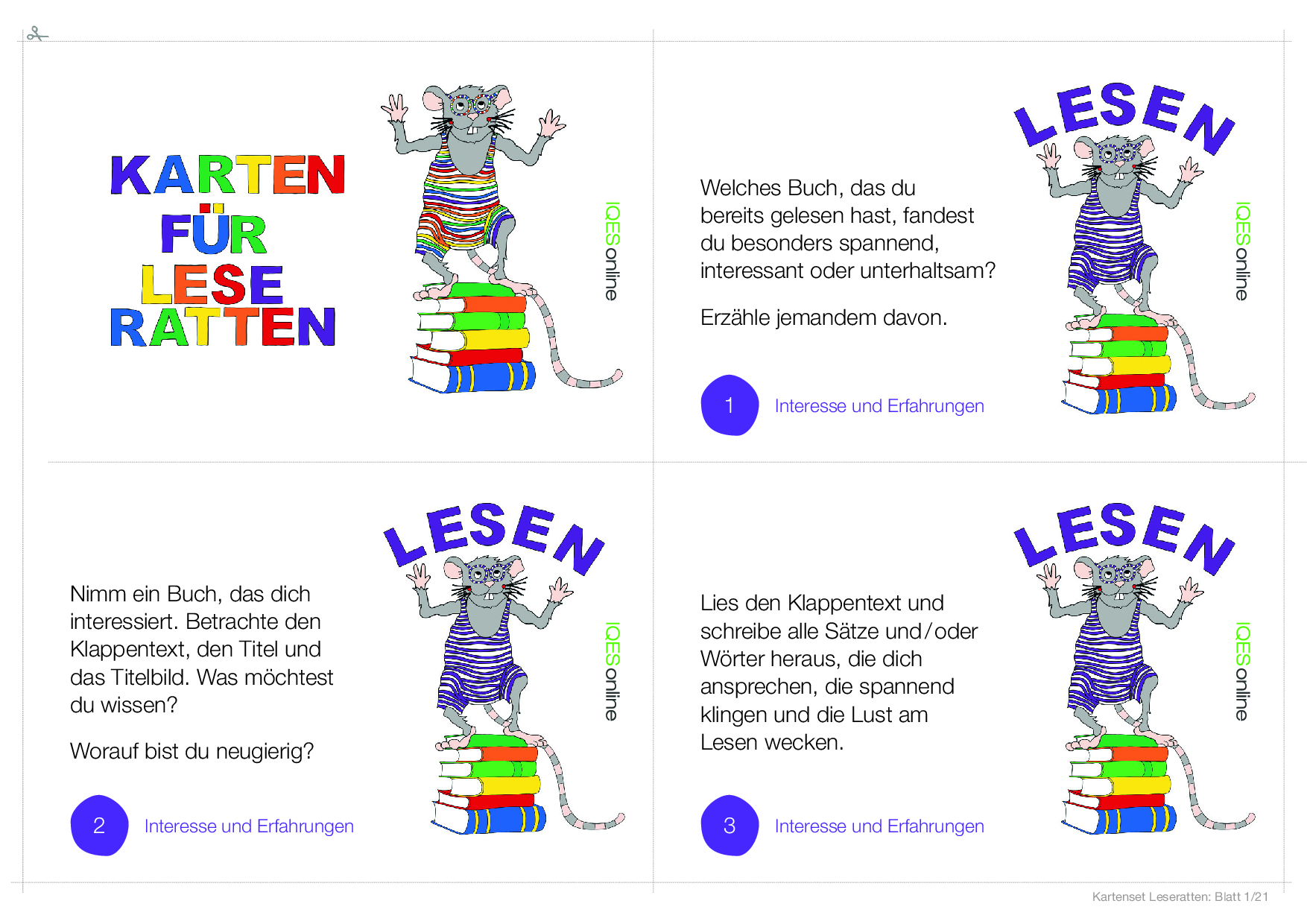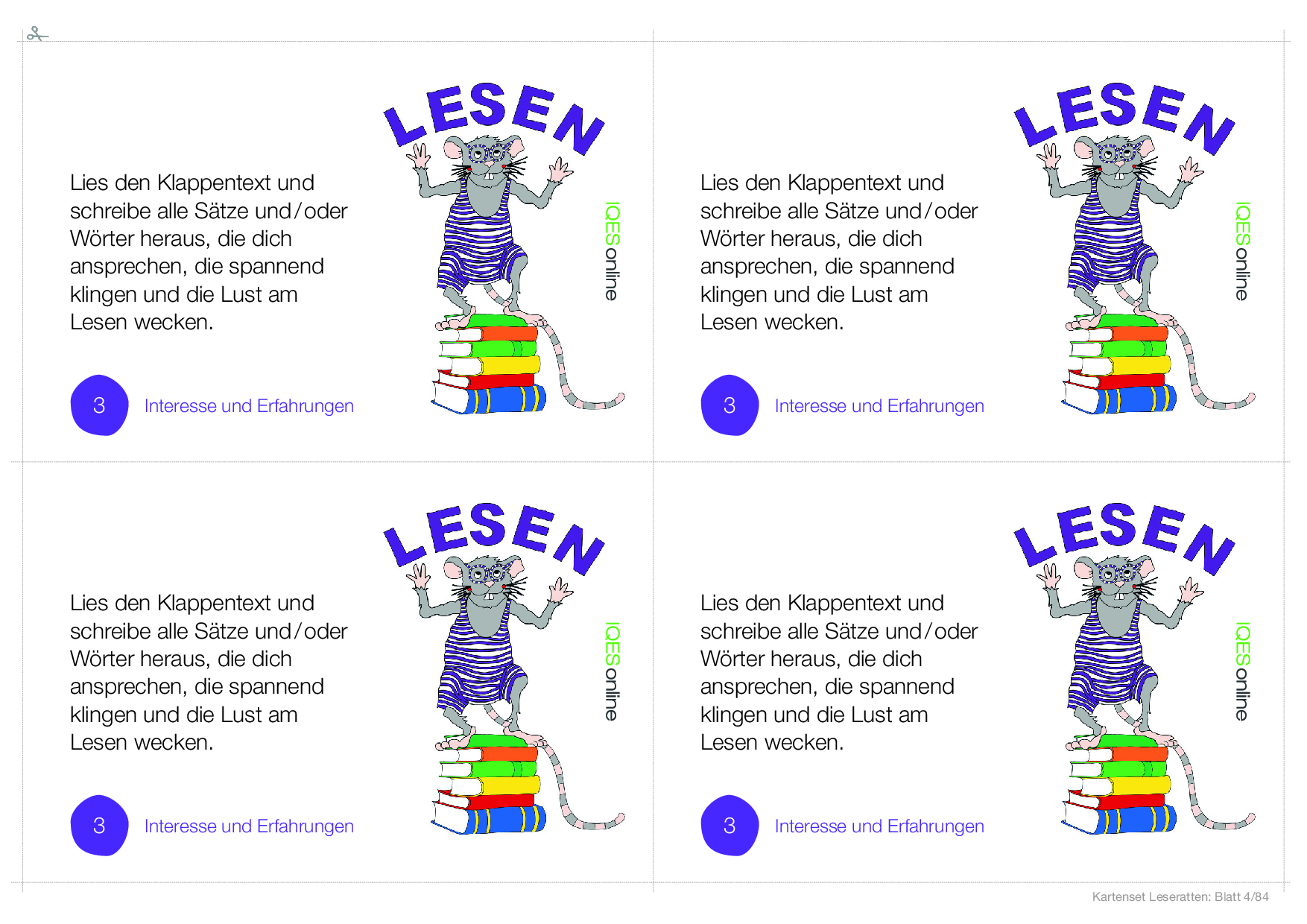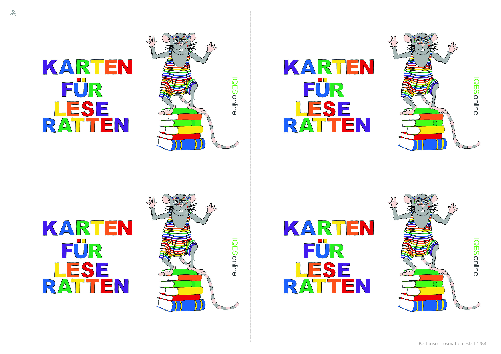 In diesem Dokument befindet sich eine Vorlage, um einen ganzen Klassensatz von Leserattenkarten zu kopieren. Es befinden sich vier Karten der gleichen Leserattenkarte auf einer Seite.