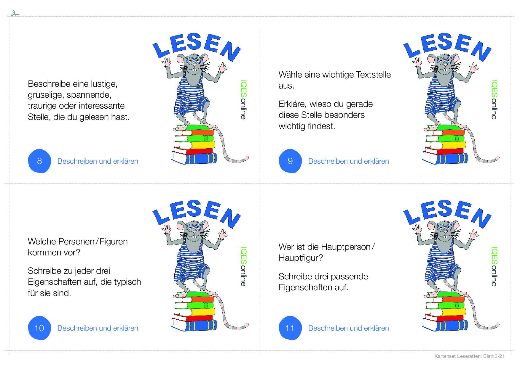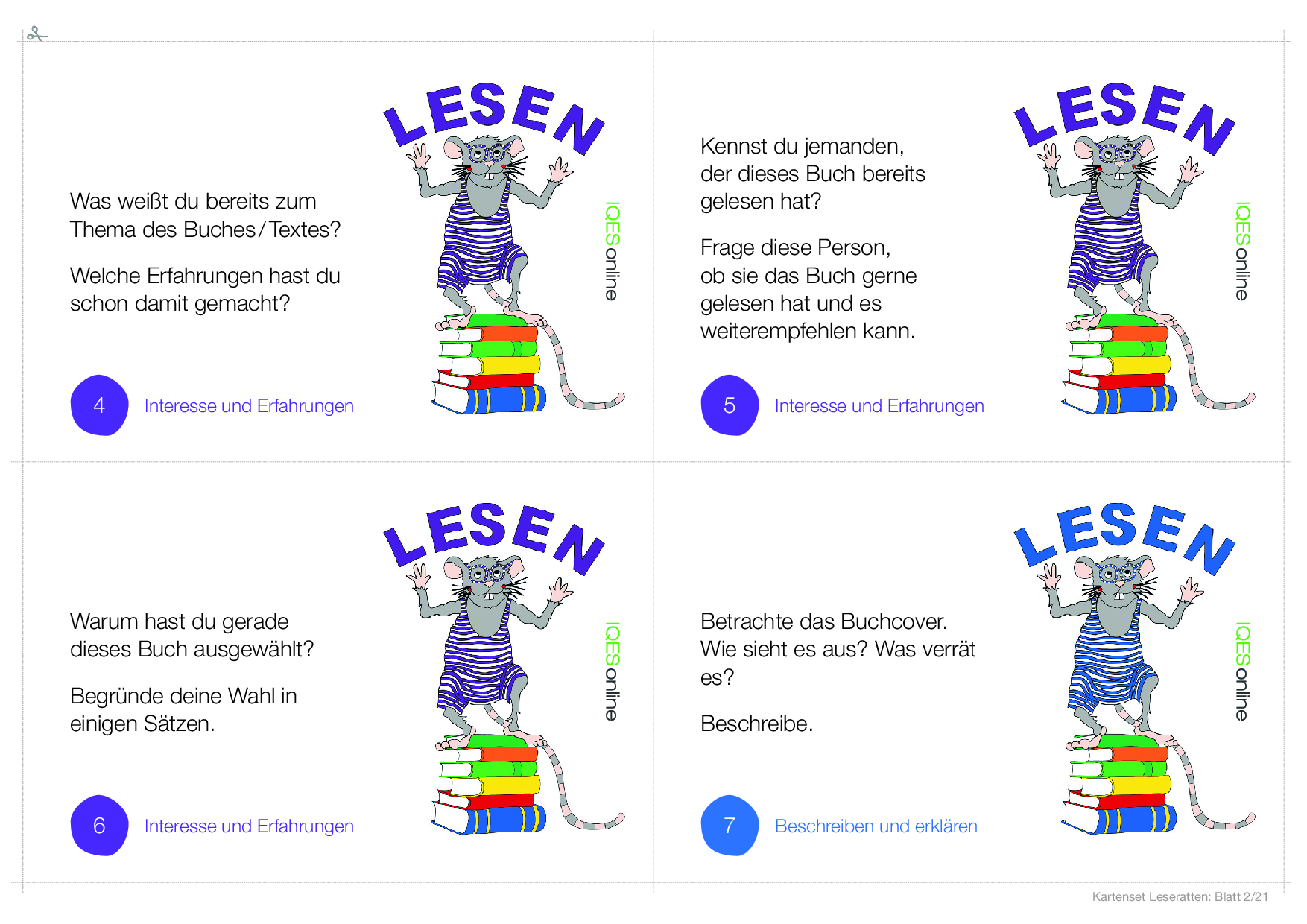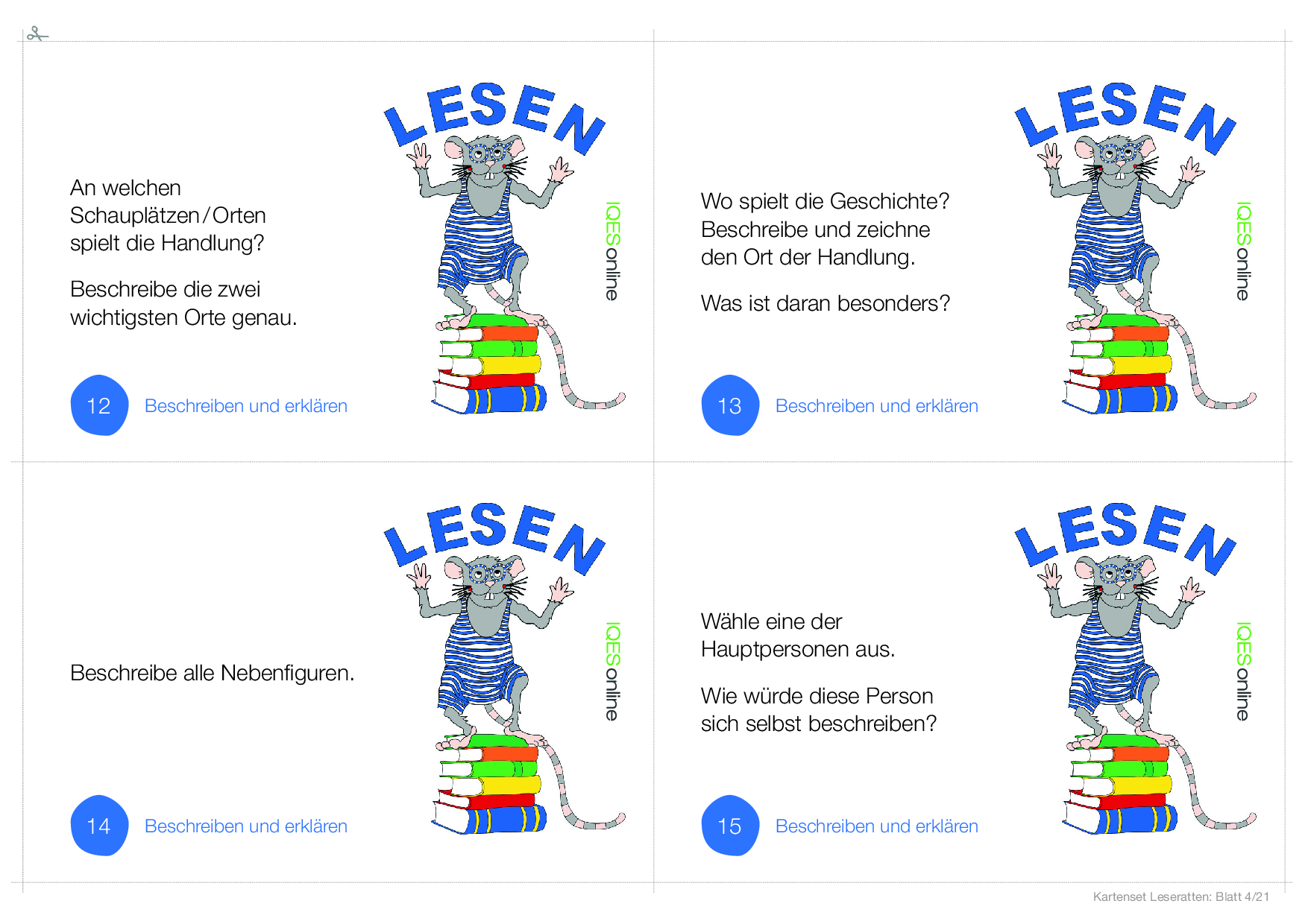 In diesem Dokument befindet sich eine Vorlage, um einen ganzen Klassensatz von Leserattenkarten zu kopieren. Es befinden sich vier Karten der gleichen Leserattenkarte auf einer Seite.