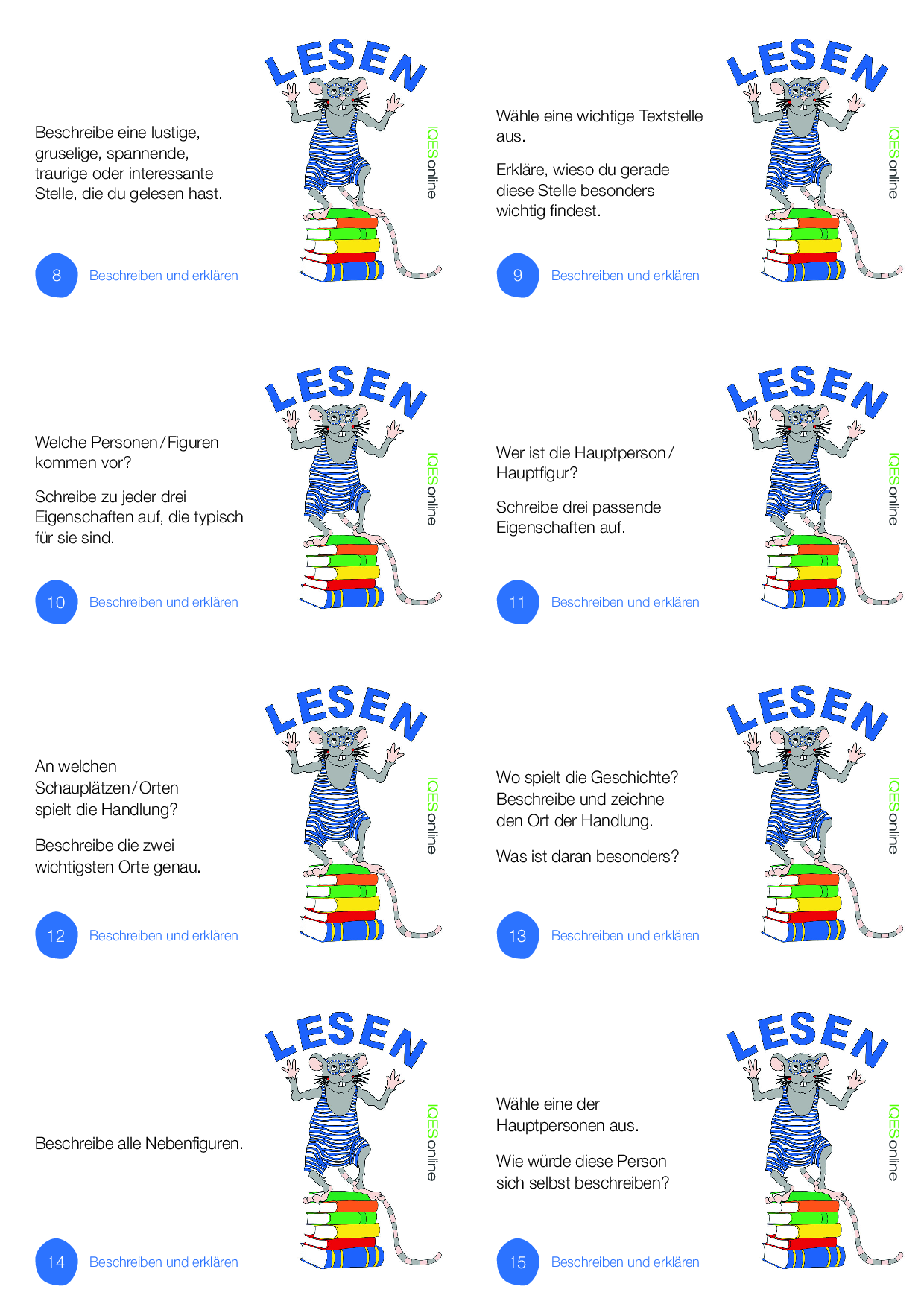 Hier finden sich Kleinplakate im A4-Format zu den 83 Karten für Leseratten. Im Klassenzimmer aufgehängt, können ausgewählte Plakate die Aufträge für alle visualisieren.