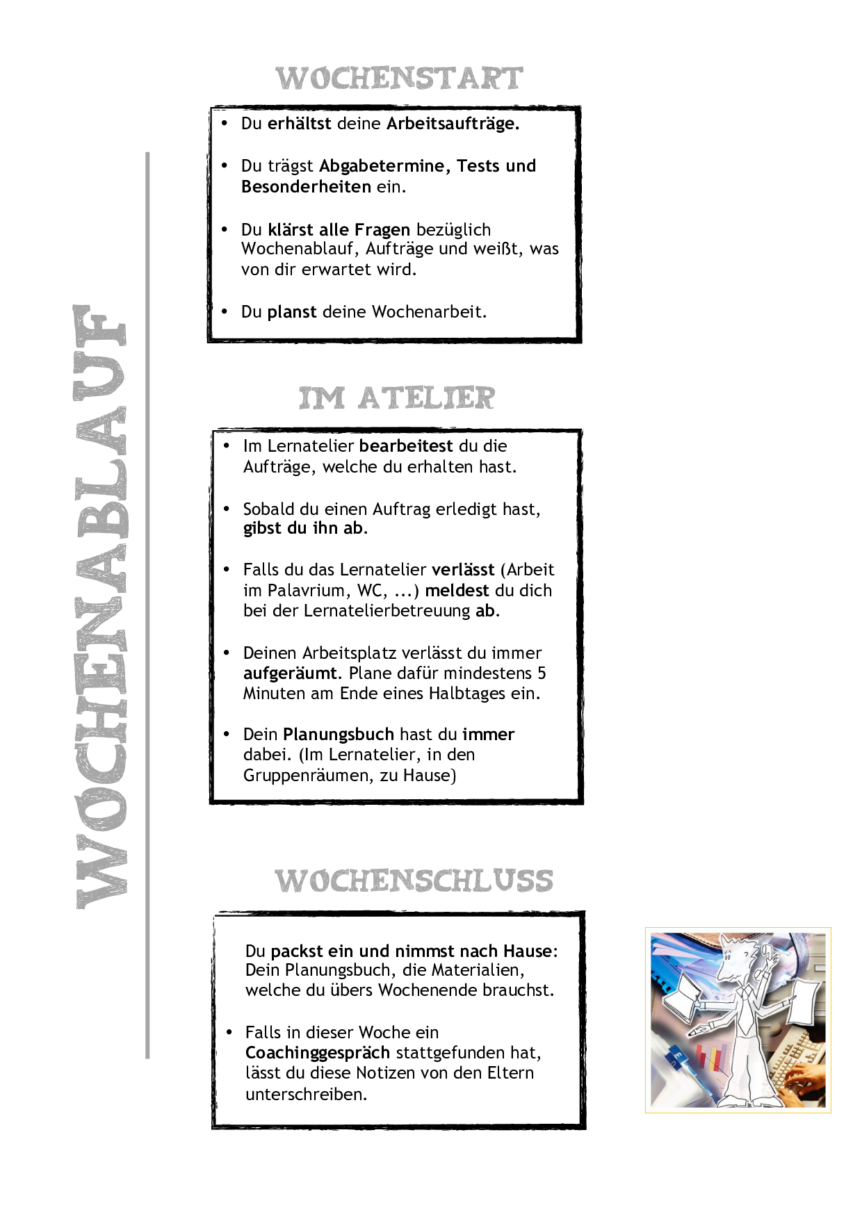 Dieses Planungsbuch der Sekundarschule Petermoos enthält viele Vorlagenwie Wochenpläne und Absenzenliste, damit die Schüler und Schülerinnen ihren Lernprozess so selbstständig wie möglich gestalten können.