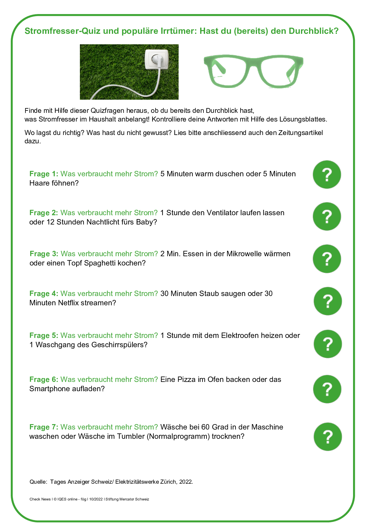 »Quizfragen Stromfresser-Quiz« – CheckNews Energie sparen