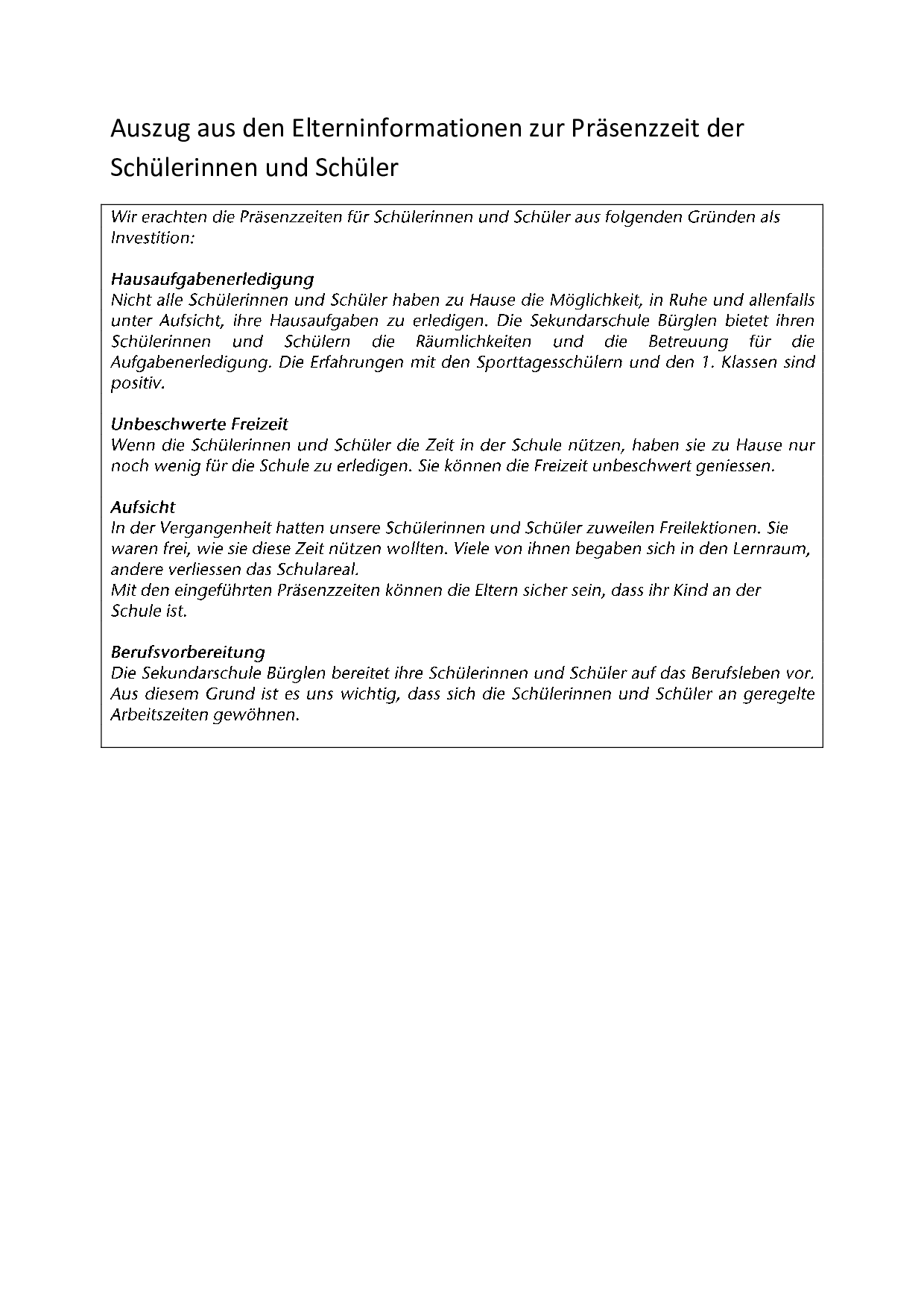 Hier finden Sie einen Auszug einer Elterninformation der Sekundarschule Bürglen. Thema ist die Präsenzzeit der Schülerinnen und Schüler und wieso die Schule diese als wichtig erachtet.