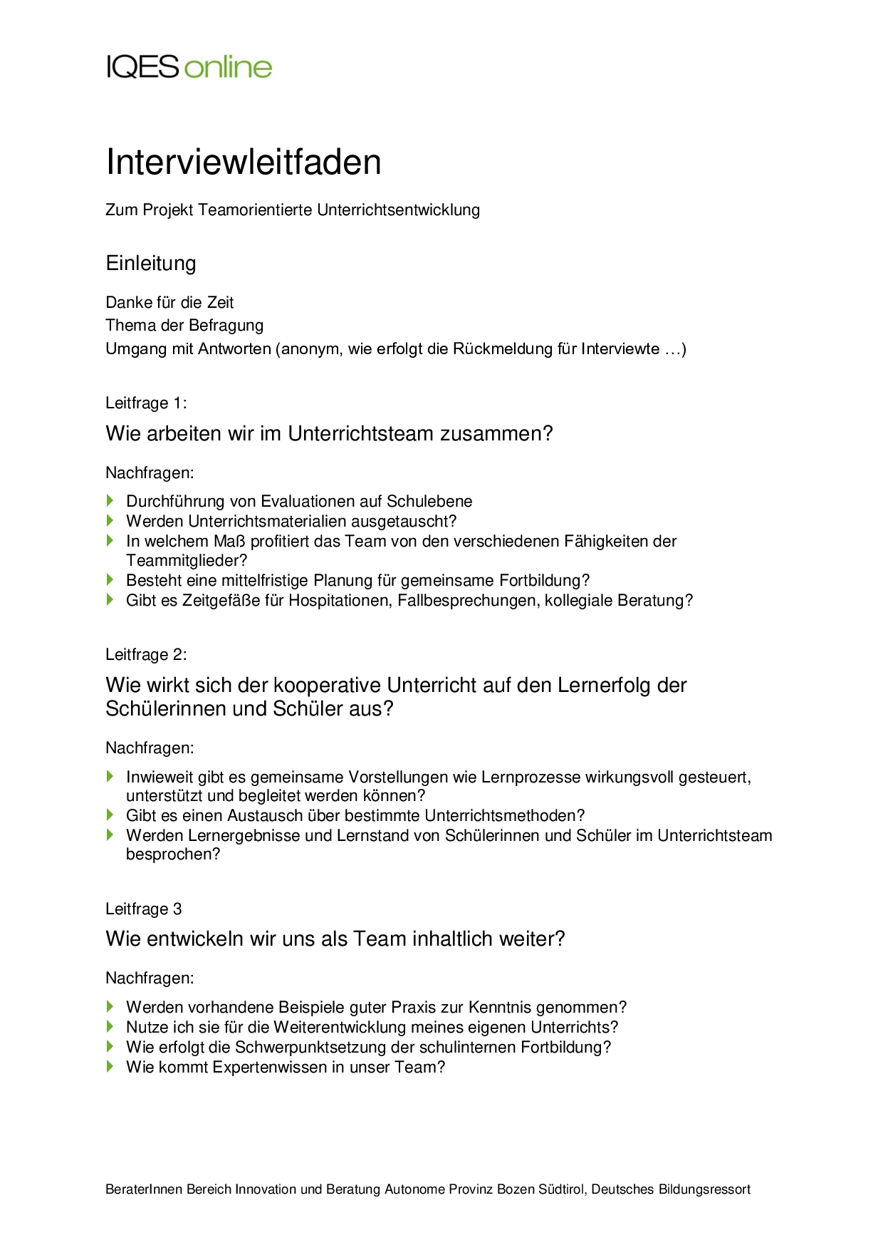 Der Leitfaden dient als Grundlage für ein strukuriertes Gespräch über das Projekt Teamorientierte Unterrichtsentwicklung in der Autonomen Provinz Bozen-Südtirol. Er orientiert sich am Dokument «Interviewtechnik» von Hans Keller, das ebenfalls in der IQES-Bibliothek erhältlich ist.